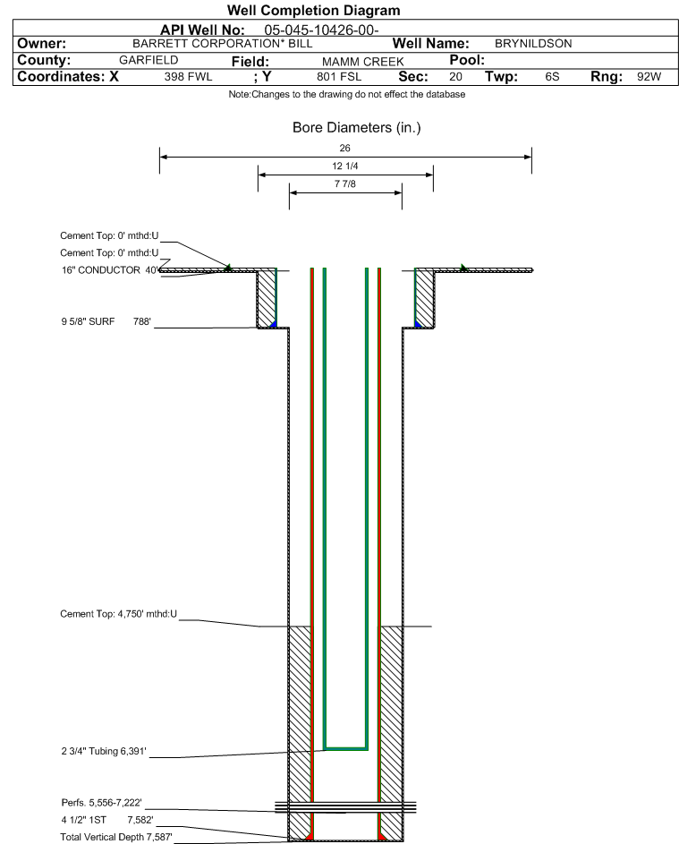 Wellbore #00 Wellbore Classification: GW Status: PR - 6/8/2009 Measured TD: 7600 ft. Vertical TD: 7587 ft.| Wellbore Data for Original Wellbore | Wellbore Classification: GW PR - 6/8/2009 | | Wellbore Permit | DIRECTIONAL | | Permit #: | 20084585 | Expiration Date: | 9/15/2009 | | Proposed Top PZ Location: | Sec: Twp: | Footage: 1096 FSL 662 FWL | | Bottom Hole Location: | Sec:20 Twp: 6S 92W | Footage: 1096 FSL 662 FWL | | Proposed Depth/Form: | 7556 ft. | | Surface Mineral Owner Same: | No | | Mineral Owner: | FEE | Surface Owner: | FEE | | Unit: | | Unit Number: | | | Formation And Spacing: | Code: ILES , Formation: ILES , Order: 191-10 , Unit Acreage: 640, Drill Unit: ALL | | Formation And Spacing: | Code: WMFK , Formation: WILLIAMS FORK , Order: 191-8 , Unit Acreage: 640, Drill Unit: ALL |