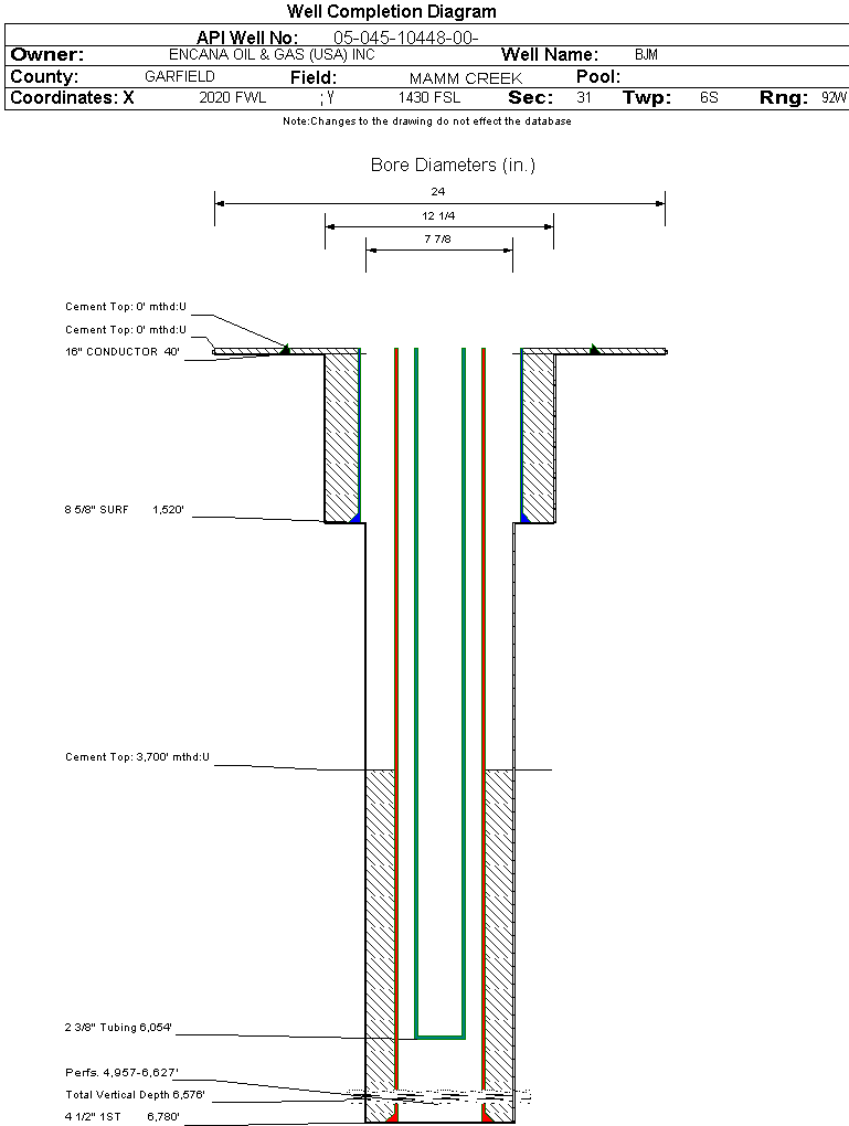 | Wellbore Completed | | Completion Date: | 12/27/2005 | | Spud Date: | 3/18/2005 | Spud Date Is: | ACTUAL | | Measured TD: | 6780 ft. | Measured PB depth: | 6728 ft. | | True Vertical TD: | 6576 ft. | True Vertical PB depth: | | | Top PZ Location: | Sec:31 Twp: 6S 92W | Footage: 671 FSL 1087 FEL | | Bottom Hole Location: | Sec:31 Twp: 6S 92W | Footage: 671 FSL 1087 FEL | | Log Types: | RST,/GR/CCL; BOND LOG | | Casing: | String Type: CONDUCTOR, Hole Size: 24 in., Size: 16 in., Top: 0 ft., Depth: 40 ft., Weight: , Citings Type: ACTUAL | | Cement: | Sacks: , Top: 0 ft., Bottom: 40 ft., Determination Method: CALC | | Casing: | String Type: SURF, Hole Size: 12.25 in., Size: 8.625 in., Top: 0 ft., Depth: 1520 ft., Weight: , Citings Type: ACTUAL | | Cement: | Sacks: 1060, Top: 0 ft., Bottom: 1520 ft., Determination Method: CALC | | Casing: | String Type: 1ST, Hole Size: 7.875 in., Size: 4.5 in., Top: 0 ft., Depth: 6780 ft., Weight: , Citings Type: ACTUAL | | Cement: | Sacks: 900, Top: 3700 ft., Bottom: 6780 ft., Determination Method: CBL | | Formation | Interval Top | Log Bottom | Cored | DSTs | | WASATCH | 0 ft. | 3819 ft. | N | N | | WILLIAMS FORK | 3820 ft. | | N | N |