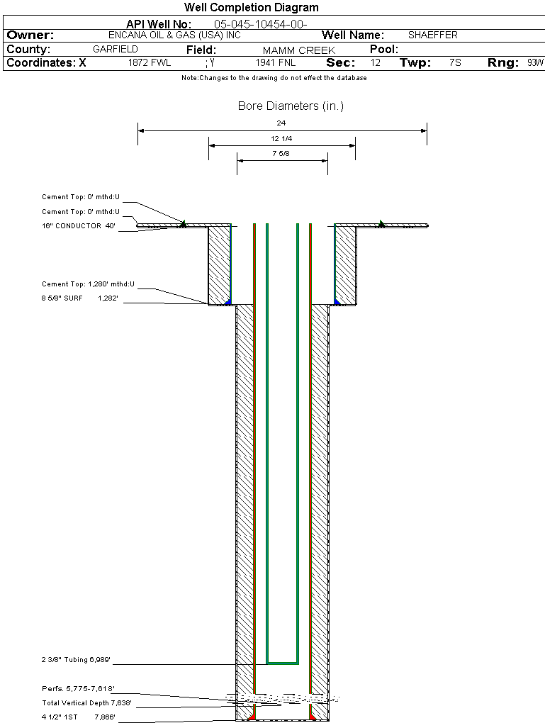 | Wellbore Completed | | Completion Date: | 11/16/2005 | | Spud Date: | 3/11/2005 | Spud Date Is: | ACTUAL | | Measured TD: | 7871 ft. | Measured PB depth: | 7821 ft. | | True Vertical TD: | 7638 ft. | True Vertical PB depth: | | | Top PZ Location: | Sec:12 Twp: 7S 93W | Footage: 607 FNL 2571 FWL | | Bottom Hole Location: | Sec:12 Twp: 7S 93W | Footage: 607 FNL 2571 FWL | | Log Types: | RST/ CBL | | Casing: | String Type: CONDUCTOR, Hole Size: 24 in., Size: 16 in., Top: 0 ft., Depth: 40 ft., Weight: , Citings Type: ACTUAL | | Cement: | Sacks: , Top: 0 ft., Bottom: 40 ft., Determination Method: CALC | | Casing: | String Type: SURF, Hole Size: 12.25 in., Size: 8.625 in., Top: 0 ft., Depth: 1282 ft., Weight: , Citings Type: ACTUAL | | Cement: | Sacks: 860, Top: 0 ft., Bottom: 1282 ft., Determination Method: CALC | | Casing: | String Type: 1ST, Hole Size: 7.625 in., Size: 4.5 in., Top: 0 ft., Depth: 7866 ft., Weight: , Citings Type: ACTUAL | | Cement: | Sacks: 1695, Top: 1280 ft., Bottom: 7866 ft., Determination Method: CALC | | Formation | Interval Top | Log Bottom | Cored | DSTs | | WASATCH | 0 ft. | 1596 ft. | N | N | | WILLIAMS FORK | 4597 ft. | 7724 ft. | N | N | | ROLLINS | 7725 ft. | 7871 ft. | N | N |
