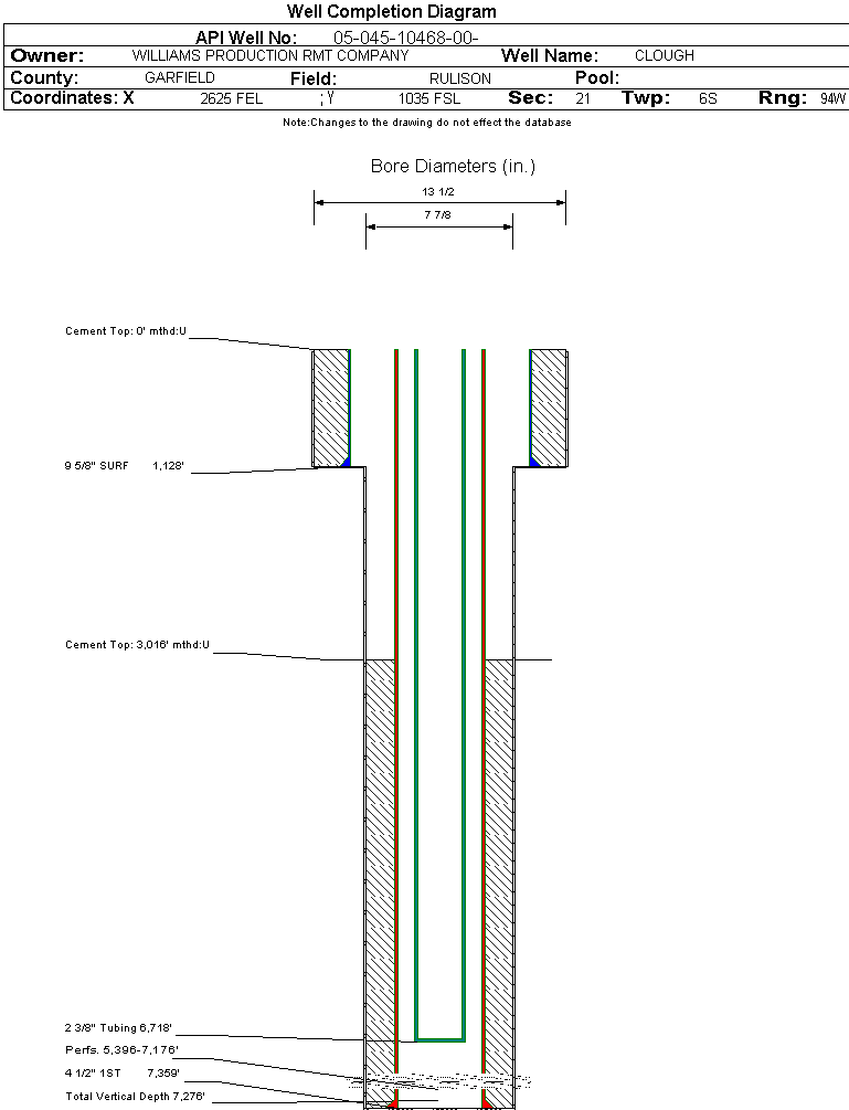 Wellbore #00 Wellbore Classification: GW Status: PR - 9/26/2005 Measured TD: 7375 ft. Vertical TD: 7276 ft.| Wellbore Data for Original Wellbore | Wellbore Classification: GW PR - 9/26/2005 | | Wellbore Permit | DIRECTIONAL | | Permit #: | 20050401 | Expiration Date: | 3/8/2006 | | Proposed Top PZ Location: | Sec: Twp: | Footage: 273 FSL 2492 FEL | | Bottom Hole Location: | Sec: Twp: | Footage: 273 FSL 2492 FEL | | Proposed Depth/Form: | 7702 ft. | | Surface Mineral Owner Same: | Yes | | Mineral Owner: | FEE | Surface Owner: | FEE | | Unit: | | Unit Number: | | | Formation And Spacing: | Code: WMFK , Formation: WILLIAMS FORK , Order: 139-38 , Unit Acreage: 320, Drill Unit: S2 |