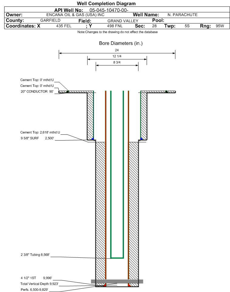 | Wellbore Completed | | Completion Date: | 10/24/2008 | | Spud Date: | 9/10/2005 | Spud Date Is: | ACTUAL | | Measured TD: | 10020 ft. | Measured PB depth: | 9967 ft. | | True Vertical TD: | 9923 ft. | True Vertical PB depth: | 9870 ft. | | Top PZ Location: | Sec:21 Twp: 5S 95W | Footage: 510 FSL 184 FEL | | Bottom Hole Location: | Sec:21 Twp: 5S 95W | Footage: 510 FSL 184 FEL | | Log Types: | CBL, MUD, RST | | Log Types: | | | Casing: | String Type: CONDUCTOR, Hole Size: 24 in., Size: 20 in., Top: 0 ft., Depth: 90 ft., Weight: , Citings Type: ACTUAL | | Cement: | Sacks: 6, Top: 0 ft., Bottom: 90 ft., Determination Method: | | Casing: | String Type: SURF, Hole Size: 12.25 in., Size: 9.625 in., Top: 0 ft., Depth: 2500 ft., Weight: , Citings Type: ACTUAL | | Cement: | Sacks: 1085, Top: 0 ft., Bottom: 2545 ft., Determination Method: | | Casing: | String Type: 1ST, Hole Size: 8.75 in., Size: 4.5 in., Top: 0 ft., Depth: 9996 ft., Weight: , Citings Type: ACTUAL | | Cement: | Sacks: 1435, Top: 2618 ft., Bottom: 9996 ft., Determination Method: CBL | | Formation | Interval Top | Log Bottom | Cored | DSTs | | WILLIAMS FORK | 6296 ft. | 9928 ft. | N | N | | ROLLINS | 9928 ft. | 10020 ft. | N | N |