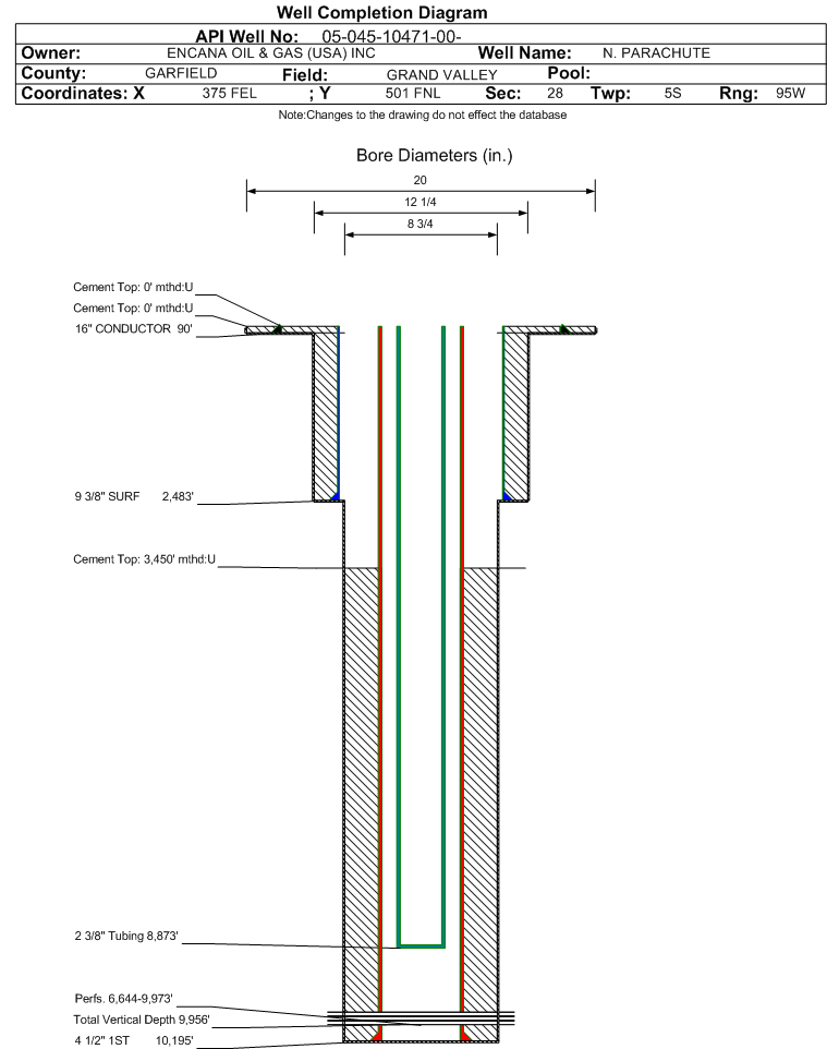 Wellbore #00 Wellbore Classification: GW Status: PR - 6/25/2007 Measured TD: 10215 ft. Vertical TD: 9956 ft.| Wellbore Data for Original Wellbore | Wellbore Classification: GW PR - 6/25/2007 | | Wellbore Permit | DIRECTIONAL | | Permit #: | 20050429 | Expiration Date: | 3/8/2006 | | Proposed Top PZ Location: | Sec:22 Twp: 5S 95W | Footage: 384 FSL 1076 FWL | | Bottom Hole Location: | Sec:22 Twp: 5S 95W | Footage: 384 FSL 1076 FWL | | Proposed Depth/Form: | 10730 ft. | | Surface Mineral Owner Same: | Yes | | Mineral Owner: | FEE | Surface Owner: | FEE | | Unit: | | Unit Number: | | | Formation And Spacing: | Code: ILES , Formation: ILES , Order: , Unit Acreage: , Drill Unit: | | Formation And Spacing: | Code: OHCRK , Formation: OHIO CREEK , Order: , Unit Acreage: , Drill Unit: | | Formation And Spacing: | Code: WMFK , Formation: WILLIAMS FORK , Order: , Unit Acreage: , Drill Unit: | | Formation And Spacing: | Code: WSTC , Formation: WASATCH , Order: , Unit Acreage: , Drill Unit: |