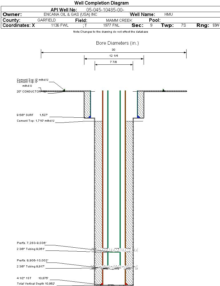 | Wellbore Completed | | Completion Date: | 7/28/2005 | | Spud Date: | 6/29/2005 | Spud Date Is: | ACTUAL | | Measured TD: | 10890 ft. | Measured PB depth: | 10189 ft. | | True Vertical TD: | 10862 ft. | True Vertical PB depth: | 0 ft. | | Top PZ Location: | Sec: Twp: | Footage: 1980 FNL 691 FWL | | Bottom Hole Location: | Sec:9 Twp: 7S 93W | Footage: 1980 FNL 676 FWL | | Log Types: | PEX, DSI, CBL | | Casing: | String Type: CONDUCTOR, Hole Size: 30 in., Size: 20 in., Top: 0 ft., Depth: 40 ft., Weight: 42 , Citings Type: ACTUAL | | Cement: | Sacks: , Top: 0 ft., Bottom: 40 ft., Determination Method: CALC | | Casing: | String Type: SURF, Hole Size: 12.25 in., Size: 9.625 in., Top: 0 ft., Depth: 1527 ft., Weight: 24 , Citings Type: ACTUAL | | Cement: | Sacks: 1075, Top: 0 ft., Bottom: 1527 ft., Determination Method: CALC | | Casing: | String Type: 1ST, Hole Size: 7.875 in., Size: 4.5 in., Top: 0 ft., Depth: 10875 ft., Weight: 11.6 , Citings Type: ACTUAL | | Cement: | Sacks: 2445, Top: 1710 ft., Bottom: 10890 ft., Determination Method: CBL | | Formation | Interval Top | Log Bottom | Cored | DSTs | | WASATCH | 0 ft. | 6231 ft. | N | N | | WILLIAMS FORK | 6232 ft. | 9221 ft. | N | N | | ROLLINS | 9222 ft. | 9664 ft. | N | N | | COZZETTE | 9665 ft. | 9886 ft. | N | N | | CORCORAN | 9887 ft. | 10890 ft. | N | N |
