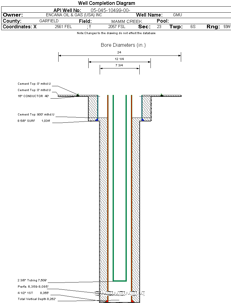| Wellbore Completed | | Completion Date: | 8/16/2005 | | Spud Date: | 6/4/2005 | Spud Date Is: | ACTUAL | | Measured TD: | 8359 ft. | Measured PB depth: | 8286 ft. | | True Vertical TD: | 8262 ft. | True Vertical PB depth: | | | Top PZ Location: | Sec: Twp: | Footage: 2640 FNL 1980 FWL | | Bottom Hole Location: | Sec: Twp: | Footage: 2640 FNL 1980 FWL | | Log Types: | PEX AI/GR/SP, CBL, RST | | Casing: | String Type: CONDUCTOR, Hole Size: 24 in., Size: 16 in., Top: 0 ft., Depth: 40 ft., Weight: 40 , Citings Type: ACTUAL | | Cement: | Sacks: 4, Top: 0 ft., Bottom: 40 ft., Determination Method: CALC | | Casing: | String Type: SURF, Hole Size: 12.25 in., Size: 8.625 in., Top: 0 ft., Depth: 1034 ft., Weight: 24 , Citings Type: ACTUAL | | Cement: | Sacks: 740, Top: 0 ft., Bottom: 1035 ft., Determination Method: CALC | | Casing: | String Type: 1ST, Hole Size: 7.075 in., Size: 4.5 in., Top: 0 ft., Depth: 8355 ft., Weight: 11.6 , Citings Type: ACTUAL | | Cement: | Sacks: 1450, Top: 900 ft., Bottom: 8359 ft., Determination Method: CBL | | Formation | Interval Top | Log Bottom | Cored | DSTs | | WASATCH | 0 ft. | | N | N | | WILLIAMS FORK | 5121 ft. | | N | N | | ROLLINS | 8220 ft. | | N | N |
