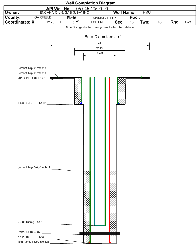 | Wellbore Completed | | Completion Date: | 6/4/2008 | | Spud Date: | 8/1/2005 | Spud Date Is: | ACTUAL | | Measured TD: | 9583 ft. | Measured PB depth: | 9359 ft. | | True Vertical TD: | 9536 ft. | True Vertical PB depth: | 9312 ft. | | Top PZ Location: | Sec:9 Twp: 7S 93W | Footage: 10 FSL 1971 FEL | | Bottom Hole Location: | Sec:9 Twp: 7S 93W | Footage: 10 FSL 1971 FEL | | Log Types: | RST, CBL | | Casing: | String Type: CONDUCTOR, Hole Size: 24 in., Size: 20 in., Top: 0 ft., Depth: 40 ft., Weight: , Citings Type: ACTUAL | | Cement: | Sacks: 4, Top: 0 ft., Bottom: 40 ft., Determination Method: CALC | | Casing: | String Type: SURF, Hole Size: 12.25 in., Size: 8.625 in., Top: 0 ft., Depth: 1541 ft., Weight: , Citings Type: ACTUAL | | Cement: | Sacks: 1066, Top: 0 ft., Bottom: 1541 ft., Determination Method: CALC | | Casing: | String Type: 1ST, Hole Size: 7.875 in., Size: 4.5 in., Top: 0 ft., Depth: 9573 ft., Weight: , Citings Type: ACTUAL | | Cement: | Sacks: 721, Top: 5400 ft., Bottom: 9583 ft., Determination Method: CBL | | Formation | Interval Top | Log Bottom | Cored | DSTs | | WASATCH | 0 ft. | 6557 ft. | N | N | | WILLIAMS FORK | 6558 ft. | 7524 ft. | N | N | | ROLLINS | 9495 ft. | 9583 ft. | N | N |