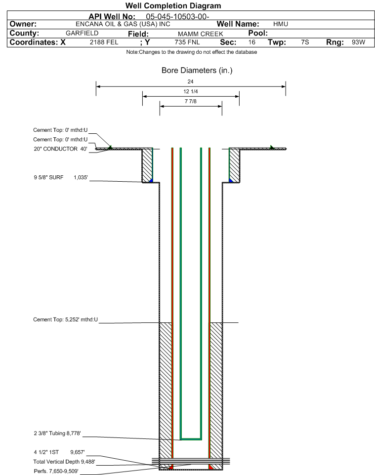 | Wellbore Completed | | Completion Date: | 8/8/2008 | | Spud Date: | 7/25/2008 | Spud Date Is: | ACTUAL | | Measured TD: | 9667 ft. | Measured PB depth: | 9596 ft. | | True Vertical TD: | 9488 ft. | True Vertical PB depth: | | | Top PZ Location: | Sec:16 Twp: 7S 93W | Footage: 1980 FNL 2053 FWL | | Bottom Hole Location: | Sec:16 Twp: 7S 93W | Footage: 1980 FNL 2053 FWL | | Log Types: | CBL, RES-SAT TOOL | | Casing: | String Type: CONDUCTOR, Hole Size: 24 in., Size: 20 in., Top: 0 ft., Depth: 40 ft., Weight: 53 , Citings Type: ACTUAL | | Cement: | Sacks: , Top: 0 ft., Bottom: 40 ft., Determination Method: CALC | | Casing: | String Type: SURF, Hole Size: 12.25 in., Size: 9.625 in., Top: 0 ft., Depth: 1035 ft., Weight: 36 , Citings Type: ACTUAL | | Cement: | Sacks: 346, Top: 0 ft., Bottom: 1035 ft., Determination Method: CALC | | Casing: | String Type: 1ST, Hole Size: 7.875 in., Size: 4.5 in., Top: 0 ft., Depth: 9657 ft., Weight: 11.6 , Citings Type: ACTUAL | | Cement: | Sacks: 718, Top: 5252 ft., Bottom: 9657 ft., Determination Method: CBL | | Formation | Interval Top | Log Bottom | Cored | DSTs | | WASATCH | 0 ft. | 6509 ft. | N | N | | WILLIAMS FORK | 6510 ft. | 9544 ft. | N | N | | ROLLINS | 9545 ft. | 9667 ft. | N | N |
