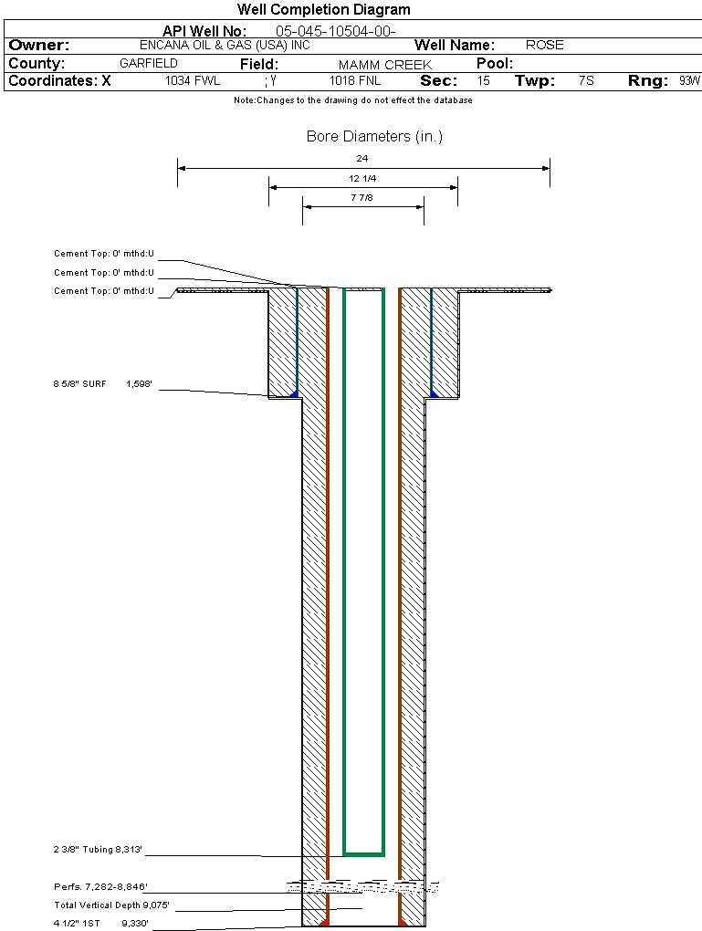 | Wellbore Completed | | Completion Date: | 5/28/2005 | | Spud Date: | 5/5/2005 | Spud Date Is: | ACTUAL | | Measured TD: | 9330 ft. | Measured PB depth: | 9085 ft. | | True Vertical TD: | 9075 ft. | True Vertical PB depth: | 0 ft. | | Top PZ Location: | Sec: Twp: | Footage: 660 FNL 660 FEL | | Bottom Hole Location: | Sec: Twp: | Footage: 660 FNL 660 FEL | | Log Types: | PEX-AIT, CBL | | Casing: | String Type: CONDUCTOR, Hole Size: 24 in., Size: 16 in., Top: 0 ft., Depth: 40 ft., Weight: 54.4 , Citings Type: ACTUAL | | Cement: | Sacks: 125, Top: 0 ft., Bottom: 40 ft., Determination Method: CALC | | Casing: | String Type: SURF, Hole Size: 12.25 in., Size: 8.625 in., Top: 0 ft., Depth: 1598 ft., Weight: 24 , Citings Type: ACTUAL | | Cement: | Sacks: 1075, Top: 0 ft., Bottom: 1598 ft., Determination Method: CALC | | Casing: | String Type: 1ST, Hole Size: 7.875 in., Size: 4.5 in., Top: 0 ft., Depth: 9330 ft., Weight: 11.6 , Citings Type: ACTUAL | | Cement: | Sacks: 1835, Top: 0 ft., Bottom: 9330 ft., Determination Method: CALC | | Formation | Interval Top | Log Bottom | Cored | DSTs | | WASATCH | 0 ft. | 6299 ft. | N | N | | WILLIAMS FORK | 6300 ft. | 9222 ft. | N | N | | ROLLINS | 9223 ft. | 9330 ft. | N | N |