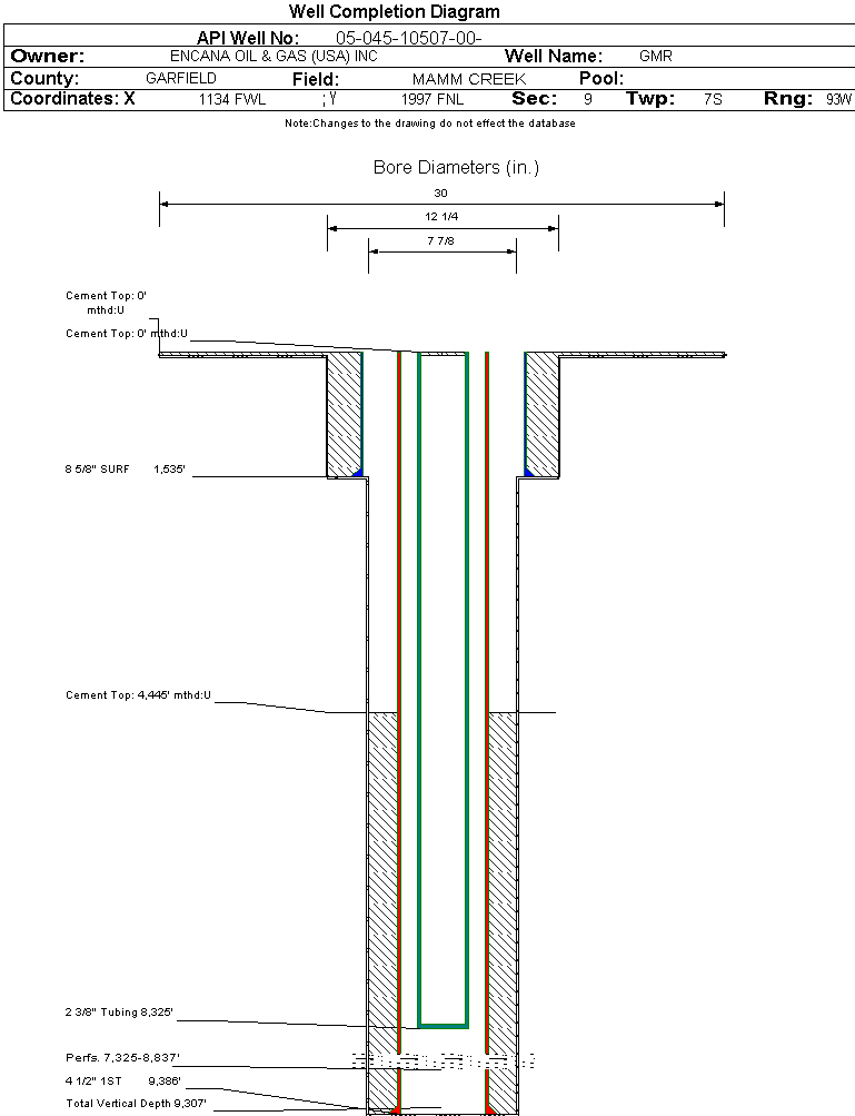 | Wellbore Completed | | Completion Date: | 10/15/2005 | | Spud Date: | 6/5/2005 | Spud Date Is: | ACTUAL | | Measured TD: | 9395 ft. | Measured PB depth: | 9137 ft. | | True Vertical TD: | 9307 ft. | True Vertical PB depth: | | | Top PZ Location: | Sec: Twp: | Footage: 2610 FNL 2000 FWL | | Bottom Hole Location: | Sec: Twp: | Footage: 2610 FNL 2000 FWL | | Log Types: | PEX, CBL | | Casing: | String Type: CONDUCTOR, Hole Size: 30 in., Size: 20 in., Top: 0 ft., Depth: 40 ft., Weight: 42 , Citings Type: ACTUAL | | Cement: | Sacks: 5, Top: 0 ft., Bottom: 40 ft., Determination Method: CALC | | Casing: | String Type: SURF, Hole Size: 12.25 in., Size: 8.625 in., Top: 0 ft., Depth: 1535 ft., Weight: 24 , Citings Type: ACTUAL | | Cement: | Sacks: 1070, Top: 0 ft., Bottom: 1535 ft., Determination Method: CALC | | Casing: | String Type: 1ST, Hole Size: 7.875 in., Size: 4.5 in., Top: 0 ft., Depth: 9386 ft., Weight: 11.6 , Citings Type: ACTUAL | | Cement: | Sacks: 1810, Top: 4445 ft., Bottom: 9395 ft., Determination Method: CALC | | Formation | Interval Top | Log Bottom | Cored | DSTs | | WASATCH | 0 ft. | 6150 ft. | N | N | | WILLIAMS FORK | 6151 ft. | 9395 ft. | N | N |