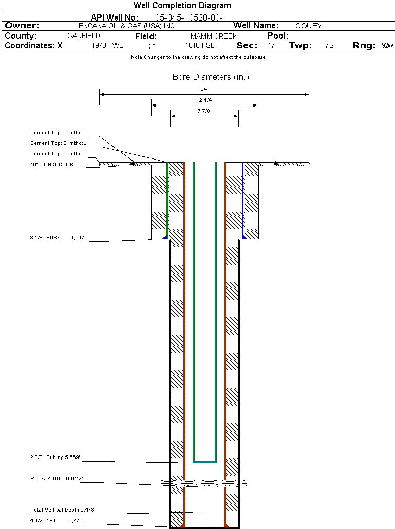 | Wellbore Completed | | Completion Date: | 9/16/2005 | | Spud Date: | 5/2/2005 | Spud Date Is: | ACTUAL | | Measured TD: | 6776 ft. | Measured PB depth: | 6780 ft. | | True Vertical TD: | 6478 ft. | True Vertical PB depth: | | | Top PZ Location: | Sec: Twp: | Footage: 1200 FSL 2020 FEL | | Bottom Hole Location: | Sec: Twp: | Footage: 1200 FSL 2020 FEL | | Log Types: | CBL, ARRAY INDUCTION/GR | | Casing: | String Type: CONDUCTOR, Hole Size: 24 in., Size: 16 in., Top: 0 ft., Depth: 40 ft., Weight: 40 , Citings Type: ACTUAL | | Cement: | Sacks: 4, Top: 0 ft., Bottom: 40 ft., Determination Method: CALC | | Casing: | String Type: SURF, Hole Size: 12.25 in., Size: 8.625 in., Top: 0 ft., Depth: 1417 ft., Weight: 32 , Citings Type: ACTUAL | | Cement: | Sacks: 350, Top: 0 ft., Bottom: 1417 ft., Determination Method: CBL | | Casing: | String Type: 1ST, Hole Size: 7.875 in., Size: 4.5 in., Top: 0 ft., Depth: 6776 ft., Weight: 11.6 , Citings Type: ACTUAL | | Cement: | Sacks: 2130, Top: 0 ft., Bottom: 6776 ft., Determination Method: CBL | | Formation | Interval Top | Log Bottom | Cored | DSTs | | WASATCH | 0 ft. | 3492 ft. | N | N | | WILLIAMS FORK | 3493 ft. | 6616 ft. | N | N | | ROLLINS | 6617 ft. | | N | N |