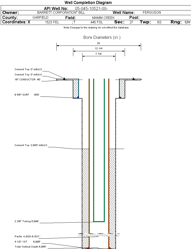 Wellbore #00 Wellbore Classification: GW Status: PR - 4/2/2008 Measured TD: 7010 ft. Vertical TD: 6955 ft.| Wellbore Data for Original Wellbore | Wellbore Classification: GW PR - 4/2/2008 | | Wellbore Permit | DIRECTIONAL | | Permit #: | 20050840 | Expiration Date: | 3/24/2006 | | Proposed Top PZ Location: | Sec:27 Twp: 6S 92W | Footage: 525 FSL 1991 FEL | | Bottom Hole Location: | Sec:27 Twp: 6S 92W | Footage: 525 FSL 1991 FEL | | Proposed Depth/Form: | 7795 ft. | | Surface Mineral Owner Same: | No | | Mineral Owner: | FEE | Surface Owner: | FEE | | Unit: | | Unit Number: | | | Formation And Spacing: | Code: WMFK , Formation: WILLIAMS FORK , Order: 191-8 , Unit Acreage: 640, Drill Unit: ALL |