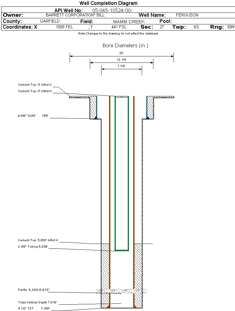Wellbore #00 Wellbore Classification: GW Status: PR - 4/2/2008 Measured TD: 7170 ft. Vertical TD: 7018 ft.| Wellbore Data for Original Wellbore | Wellbore Classification: GW PR - 4/2/2008 | | Wellbore Permit | DIRECTIONAL | | Permit #: | 20050843 | Expiration Date: | 3/24/2006 | | Proposed Top PZ Location: | Sec:27 Twp: 6S 92W | Footage: 1161 FSL 1988 FEL | | Bottom Hole Location: | Sec:27 Twp: 6S 92W | Footage: 1161 FSL 1988 FEL | | Proposed Depth/Form: | 7142 ft. | | Surface Mineral Owner Same: | No | | Mineral Owner: | FEE | Surface Owner: | FEE | | Unit: | | Unit Number: | | | Formation And Spacing: | Code: WMFK , Formation: WILLIAMS FORK , Order: 191-8 , Unit Acreage: 640, Drill Unit: ALL |