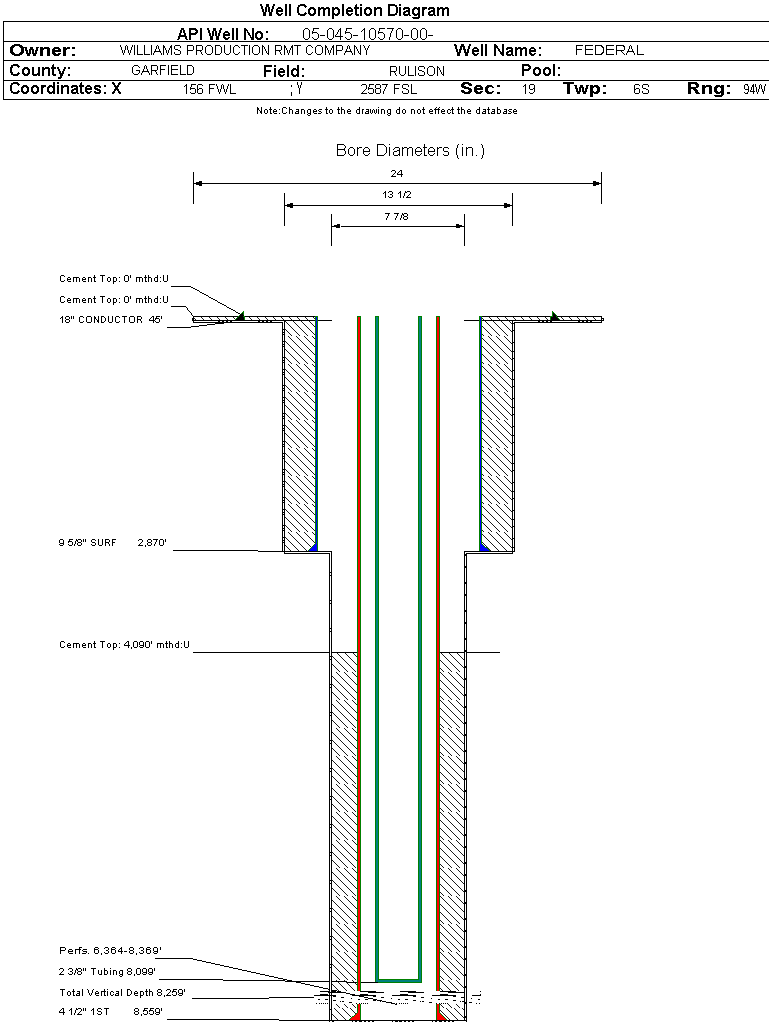Wellbore #00 Wellbore Classification: GW Status: PR - 5/16/2006 Measured TD: 8570 ft. Vertical TD: 8259 ft.| Wellbore Data for Original Wellbore | Wellbore Classification: GW PR - 5/16/2006 | | Wellbore Permit | DIRECTIONAL | | Permit #: | 20050745 | Expiration Date: | 4/5/2006 | | Proposed Top PZ Location: | Sec: Twp: | Footage: 1666 FNL 1614 FWL | | Bottom Hole Location: | Sec: Twp: | Footage: 1666 FNL 1614 FWL | | Proposed Depth/Form: | 8554 ft. | | Surface Mineral Owner Same: | Yes | | Mineral Owner: | FEDERAL | Surface Owner: | FEDERAL | | Unit: | | Unit Number: | | | Formation And Spacing: | Code: WMFK , Formation: WILLIAMS FORK , Order: 510-9 , Unit Acreage: 320, Drill Unit: N/2 |