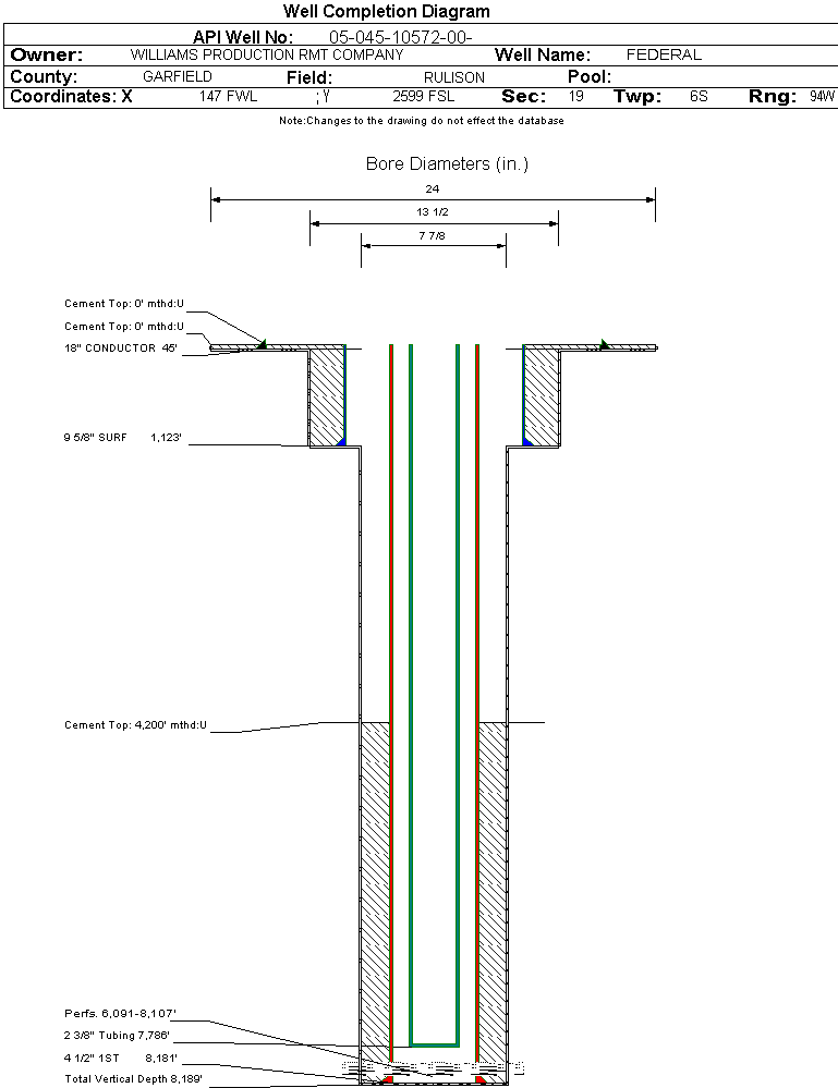 | Wellbore Completed | | Completion Date: | 11/7/2005 | | Spud Date: | 10/23/2005 | Spud Date Is: | ACTUAL | | Measured TD: | 8195 ft. | Measured PB depth: | 8114 ft. | | True Vertical TD: | 8189 ft. | True Vertical PB depth: | | | Top PZ Location: | Sec:19 Twp: 6S 94W | Footage: 2470 FNL 247 FWL | | Bottom Hole Location: | Sec:19 Twp: 6S 94W | Footage: 2470 FNL 247 FWL | | Log Types: | CBL; HIGH RESOLUTION INDUCTION, SPECTRAL DENSITY, DUAL SPACED NEUTRON | | Casing: | String Type: CONDUCTOR, Hole Size: 24 in., Size: 18 in., Top: 0 ft., Depth: 45 ft., Weight: , Citings Type: ACTUAL | | Cement: | Sacks: 25, Top: 0 ft., Bottom: 45 ft., Determination Method: | | Casing: | String Type: SURF, Hole Size: 13.5 in., Size: 9.625 in., Top: 0 ft., Depth: 1123 ft., Weight: , Citings Type: ACTUAL | | Cement: | Sacks: 375, Top: 0 ft., Bottom: 1123 ft., Determination Method: | | Casing: | String Type: 1ST, Hole Size: 7.875 in., Size: 4.5 in., Top: 0 ft., Depth: 8181 ft., Weight: , Citings Type: ACTUAL | | Cement: | Sacks: 925, Top: 4200 ft., Bottom: 8181 ft., Determination Method: CBL | | Formation | Interval Top | Log Bottom | Cored | DSTs | | WASATCH G | 2532 ft. | | N | N | | MESAVERDE | 4906 ft. | | N | N | | CAMEO | 7476 ft. | | N | N |