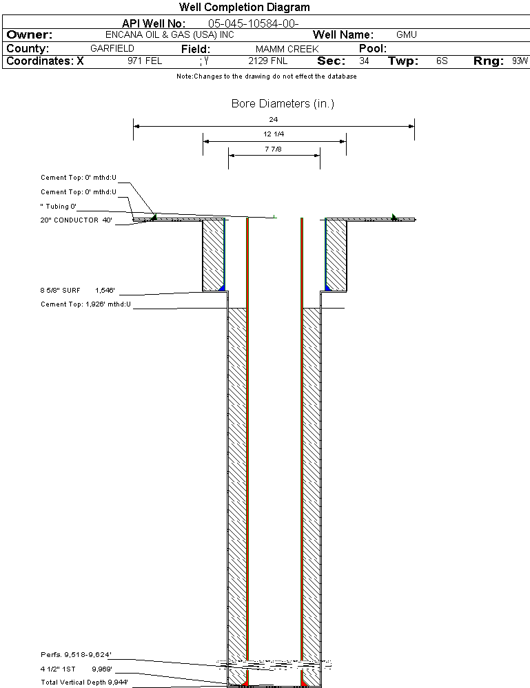 | Wellbore Completed | | Completion Date: | 9/16/2005 | | Spud Date: | 5/6/2005 | Spud Date Is: | ACTUAL | | Measured TD: | 9970 ft. | Measured PB depth: | 9892 ft. | | True Vertical TD: | 9944 ft. | True Vertical PB depth: | | | Top PZ Location: | Sec: Twp: | Footage: 1997 FNL 710 FEL | | Bottom Hole Location: | Sec:34 Twp: 6S 93W | Footage: 2012 FNL 663 FEL | | Log Types: | PEX, CBL | | Casing: | String Type: CONDUCTOR, Hole Size: 24 in., Size: 20 in., Top: 0 ft., Depth: 40 ft., Weight: , Citings Type: ACTUAL | | Cement: | Sacks: , Top: 0 ft., Bottom: 40 ft., Determination Method: CALC | | Casing: | String Type: SURF, Hole Size: 12.25 in., Size: 8.625 in., Top: 0 ft., Depth: 1546 ft., Weight: , Citings Type: ACTUAL | | Cement: | Sacks: 1060, Top: 0 ft., Bottom: 1546 ft., Determination Method: CALC | | Casing: | String Type: 1ST, Hole Size: 7.875 in., Size: 4.5 in., Top: 0 ft., Depth: 9969 ft., Weight: , Citings Type: ACTUAL | | Cement: | Sacks: 1715, Top: 1926 ft., Bottom: 9969 ft., Determination Method: CBL | | Formation | Interval Top | Log Bottom | Cored | DSTs | | WASATCH | 0 ft. | 5533 ft. | N | N | | WILLIAMS FORK | 5534 ft. | 8719 ft. | N | N | | ROLLINS | 8720 ft. | 9262 ft. | N | N | | COZZETTE | 9263 ft. | 9511 ft. | N | N | | CORCORAN | 9512 ft. | 9970 ft. | N | N |