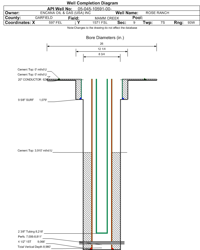 | Wellbore Completed | | Completion Date: | 9/27/2009 | | Spud Date: | 8/22/2009 | Spud Date Is: | ACTUAL | | Measured TD: | 9077 ft. | Measured PB depth: | 9019 ft. | | True Vertical TD: | 8980 ft. | True Vertical PB depth: | 8922 ft. | | Top PZ Location: | Sec:10 Twp: 7S 93W | Footage: 1282 FSL 455 FWL | | Bottom Hole Location: | Sec:10 Twp: 7S 93W | Footage: 1282 FSL 455 FWL | | Log Types: | RST, CBL | | Casing: | String Type: CONDUCTOR, Hole Size: 26 in., Size: 20 in., Top: 0 ft., Depth: 62 ft., Weight: , Citings Type: ACTUAL | | Cement: | Sacks: , Top: 0 ft., Bottom: 40 ft., Determination Method: | | Casing: | String Type: SURF, Hole Size: 12.25 in., Size: 9.625 in., Top: 0 ft., Depth: 1079 ft., Weight: , Citings Type: ACTUAL | | Cement: | Sacks: 362, Top: 0 ft., Bottom: 1079 ft., Determination Method: | | Casing: | String Type: 1ST, Hole Size: 8.75 in., Size: 4.5 in., Top: 0 ft., Depth: 9066 ft., Weight: , Citings Type: ACTUAL | | Cement: | Sacks: 981, Top: 3910 ft., Bottom: 9077 ft., Determination Method: CBL | | Formation | Interval Top | Log Bottom | Cored | DSTs | | WASATCH G | 2748 ft. | 5284 ft. | N | N | | MESAVERDE | 5285 ft. | 5949 ft. | N | N | | WILLIAMS FORK | 5950 ft. | 8873 ft. | N | N | | ROLLINS | 8874 ft. | 9077 ft. | N | N |