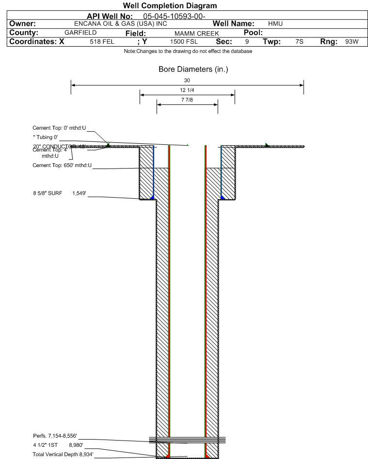 | Wellbore Completed | | Completion Date: | 6/4/2005 | | Spud Date: | 4/17/2005 | Spud Date Is: | ACTUAL | | Measured TD: | 8990 ft. | Measured PB depth: | 8350 ft. | | True Vertical TD: | 8934 ft. | True Vertical PB depth: | 0 ft. | | Top PZ Location: | Sec:9 Twp: 7S 93W | Footage: 744 FSL 776 FEL | | Bottom Hole Location: | Sec:9 Twp: 7S 93W | Footage: 744 FSL 776 FEL | | Log Types: | PEX, CBL | | Casing: | String Type: CONDUCTOR, Hole Size: 30 in., Size: 20 in., Top: 0 ft., Depth: 40 ft., Weight: 42 , Citings Type: ACTUAL | | Cement: | Sacks: , Top: 4 ft., Bottom: 54 ft., Determination Method: CALC | | Casing: | String Type: SURF, Hole Size: 12.25 in., Size: 8.625 in., Top: 0 ft., Depth: 1549 ft., Weight: 24 , Citings Type: ACTUAL | | Cement: | Sacks: 1075, Top: 0 ft., Bottom: 1550 ft., Determination Method: CALC | | Casing: | String Type: 1ST, Hole Size: 7.875 in., Size: 4.5 in., Top: 0 ft., Depth: 8980 ft., Weight: 11.6 , Citings Type: ACTUAL | | Cement: | Sacks: 2285, Top: 650 ft., Bottom: 8990 ft., Determination Method: CBL | | Formation | Interval Top | Log Bottom | Cored | DSTs | | WASATCH | 0 ft. | 5854 ft. | N | N | | WILLIAMS FORK | 5855 ft. | | N | N |
