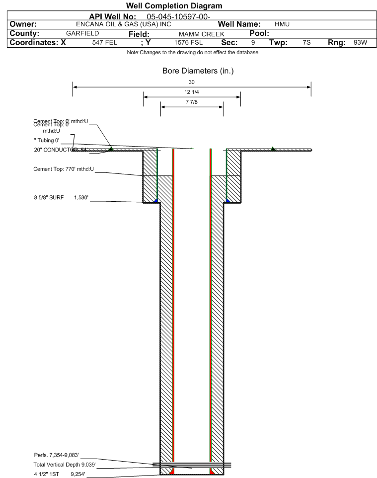 | Wellbore Completed | | Completion Date: | 8/31/2005 | | Spud Date: | 4/16/2005 | Spud Date Is: | ACTUAL | | Measured TD: | 9260 ft. | Measured PB depth: | 9206 ft. | | True Vertical TD: | 9039 ft. | True Vertical PB depth: | | | Top PZ Location: | Sec: Twp: | Footage: 1980 FNL 660 FEL | | Bottom Hole Location: | Sec: Twp: | Footage: 1980 FNL 660 FEL | | Log Types: | CBL/TEMP, RESERVIOR SATURATION | | Casing: | String Type: CONDUCTOR, Hole Size: 30 in., Size: 20 in., Top: 0 ft., Depth: 54 ft., Weight: , Citings Type: ACTUAL | | Cement: | Sacks: 5, Top: 0 ft., Bottom: 54 ft., Determination Method: CALC | | Casing: | String Type: SURF, Hole Size: 12.25 in., Size: 8.625 in., Top: 0 ft., Depth: 1530 ft., Weight: , Citings Type: ACTUAL | | Cement: | Sacks: 1095, Top: 0 ft., Bottom: 1530 ft., Determination Method: CALC | | Casing: | String Type: 1ST, Hole Size: 7.875 in., Size: 4.5 in., Top: 0 ft., Depth: 9254 ft., Weight: , Citings Type: ACTUAL | | Cement: | Sacks: 1805, Top: 770 ft., Bottom: 9254 ft., Determination Method: CBL | | Formation | Interval Top | Log Bottom | Cored | DSTs | | WASATCH | 0 ft. | 6105 ft. | N | N | | WILLIAMS FORK | 6106 ft. | 9134 ft. | N | N | | ROLLINS | 9135 ft. | | N | N |
