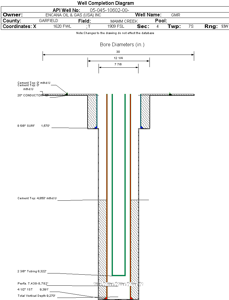 | Wellbore Completed | | Completion Date: | 9/2/2005 | | Spud Date: | 4/15/2005 | Spud Date Is: | ACTUAL | | Measured TD: | 9410 ft. | Measured PB depth: | 9053 ft. | | True Vertical TD: | 9270 ft. | True Vertical PB depth: | | | Top PZ Location: | Sec: Twp: | Footage: 10 FNL 670 FWL | | Bottom Hole Location: | Sec: Twp: | Footage: 10 FNL 670 FWL | | Log Types: | PEX, CBL/GR | | Casing: | String Type: CONDUCTOR, Hole Size: 30 in., Size: 20 in., Top: 0 ft., Depth: 40 ft., Weight: , Citings Type: ACTUAL | | Cement: | Sacks: , Top: 0 ft., Bottom: 40 ft., Determination Method: CALC | | Casing: | String Type: SURF, Hole Size: 12.25 in., Size: 8.625 in., Top: 0 ft., Depth: 1570 ft., Weight: , Citings Type: ACTUAL | | Cement: | Sacks: 1075, Top: 0 ft., Bottom: 1570 ft., Determination Method: CALC | | Casing: | String Type: 1ST, Hole Size: 7.875 in., Size: 4.5 in., Top: 0 ft., Depth: 9391 ft., Weight: , Citings Type: ACTUAL | | Cement: | Sacks: 2040, Top: 4850 ft., Bottom: 9391 ft., Determination Method: CBL | | Formation | Interval Top | Log Bottom | Cored | DSTs | | WASATCH | 0 ft. | | N | N | | WILLIAMS FORK | 6201 ft. | | N | N | | ROLLINS | 9284 ft. | | N | N |