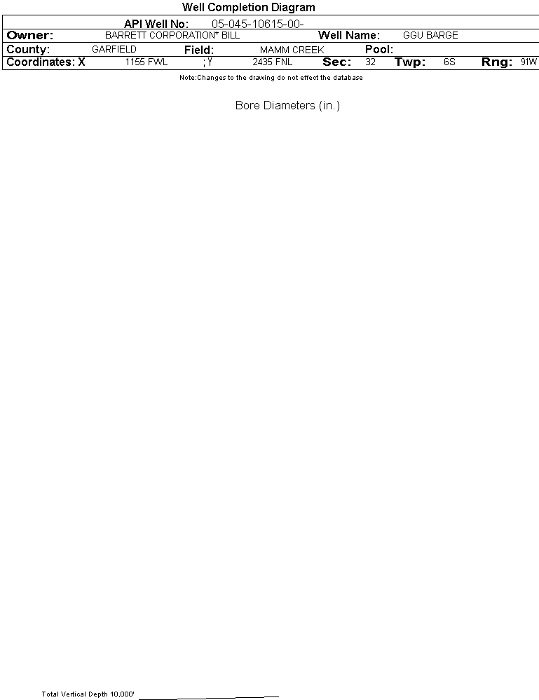 Wellbore #00 Wellbore Classification: Status: AL - 3/14/2005 Measured TD: | Wellbore Data for Original Wellbore | Wellbore Classification: AL - 3/14/2005 | | Wellbore Permit | DIRECTIONAL | | Permit #: | 20050902 | Expiration Date: | 4/14/2006 | | Proposed Top PZ Location: | Sec: Twp: | Footage: 2145 FNL 1995 FWL | | Bottom Hole Location: | Sec:32 Twp: 6S 91W | Footage: 2145 FNL 1995 FWL | | Proposed Depth/Form: | 7117 ft. | | Surface Mineral Owner Same: | No | | Mineral Owner: | FEE | Surface Owner: | FEE | | Unit: | GIBSON GULCH UN | Unit Number: | COC 052447X | | Formation And Spacing: | Code: WMFK , Formation: WILLIAMS FORK , Order: , Unit Acreage: , Drill Unit: | | Casing: | String Type: SURF, Hole Size: 12.25 in., Size: 9.625 in., Top: , Depth: 720 ft., Weight: 36 , Citings Type: PLANNED | | Cement: | Sacks: 230, Top: 0 ft., Bottom: 720 ft. | | Casing: | String Type: 1ST, Hole Size: 7.875 in., Size: 4.5 in., Top: , Depth: 7117 ft., Weight: 11.6 , Citings Type: PLANNED | | Cement: | Sacks: 700, Top: 500 ft., Bottom: 7117 ft. |