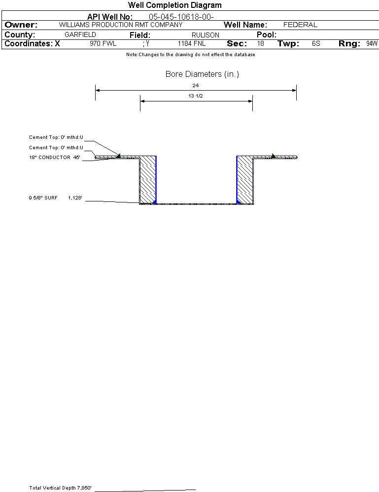 Wellbore #00 Wellbore Classification: GW Status: AB - 11/14/2005 Measured TD: 7850 ft.| Wellbore Data for Original Wellbore | Wellbore Classification: GW AB - 11/14/2005 | | Wellbore Permit | DIRECTIONAL | | Permit #: | 20050913 | Expiration Date: | 4/14/2006 | | Proposed Top PZ Location: | Sec: Twp: | Footage: 1114 FNL 232 FWL | | Bottom Hole Location: | Sec: Twp: | Footage: 1114 FNL 232 FWL | | Proposed Depth/Form: | 8992 ft. | | Surface Mineral Owner Same: | Yes | | Mineral Owner: | FEDERAL | Surface Owner: | FEDERAL | | Unit: | | Unit Number: | | | Formation And Spacing: | Code: WMFK , Formation: WILLIAMS FORK , Order: 139-40 , Unit Acreage: 320, Drill Unit: N2 |