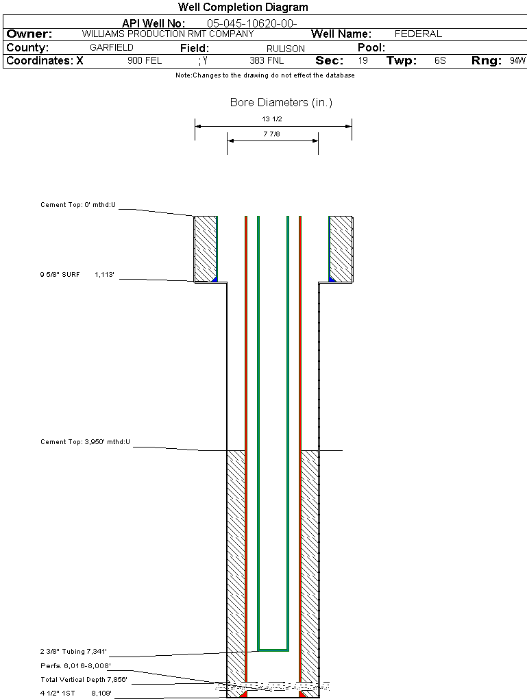 Wellbore #00 Wellbore Classification: GW Status: PR - 8/28/2005 Measured TD: 8121 ft. Vertical TD: 7856 ft.| Wellbore Data for Original Wellbore | Wellbore Classification: GW PR - 8/28/2005 | | Wellbore Permit | DIRECTIONAL | | Permit #: | 20050915 | Expiration Date: | 4/14/2006 | | Proposed Top PZ Location: | Sec:19 Twp: 6S 94W | Footage: 1301 FNL 1730 FEL | | Bottom Hole Location: | Sec:19 Twp: 6S 94W | Footage: 1301 FNL 1730 FEL | | Proposed Depth/Form: | 8198 ft. | | Surface Mineral Owner Same: | Yes | | Mineral Owner: | FEDERAL | Surface Owner: | FEDERAL | | Unit: | | Unit Number: | | | Formation And Spacing: | Code: WMFK , Formation: WILLIAMS FORK , Order: 139-40 , Unit Acreage: 320, Drill Unit: N2 |