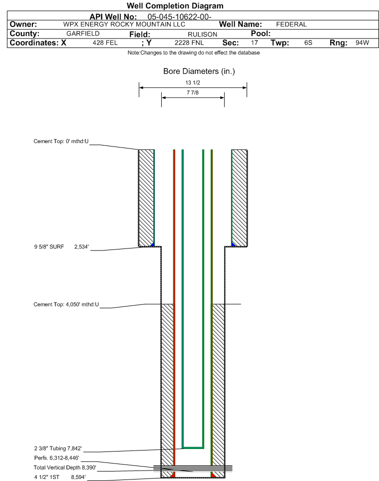 | | Perforation Data: | | Interval Top: | 6312 ft. | # Of Holes: | 108 | | Interval Bottom: | 8446 ft. | Hole Size: | 0.42 in. |