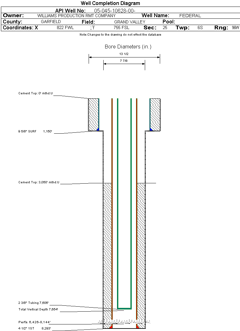 Wellbore #00 Wellbore Classification: GW Status: PR - 9/25/2006 Measured TD: 8317 ft. Vertical TD: 7654 ft.| Wellbore Data for Original Wellbore | Wellbore Classification: GW PR - 9/25/2006 | | Wellbore Permit | DIRECTIONAL | | Permit #: | 20064934 | Expiration Date: | 10/29/2007 | | Proposed Top PZ Location: | Sec: Twp: | Footage: 1095 FSL 2138 FWL | | Bottom Hole Location: | Sec:25 Twp: 6S 96W | Footage: 1095 FSL 2138 FWL | | Proposed Depth/Form: | 7795 ft. | | Surface Mineral Owner Same: | Yes | | Mineral Owner: | FEDERAL | Surface Owner: | FEDERAL | | Unit: | | Unit Number: | | | Formation And Spacing: | Code: WMFK , Formation: WILLIAMS FORK , Order: 479-12 , Unit Acreage: 320, Drill Unit: S2 | | Casing: | String Type: CONDUCTOR, Hole Size: 24 in., Size: 18 in., Top: , Depth: 45 ft., Weight: 32 , Citings Type: PLANNED | | Cement: | Sacks: 25, Top: 0 ft., Bottom: 45 ft. |