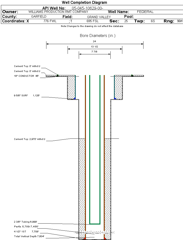 Wellbore #00 Wellbore Classification: GW Status: PR - 9/25/2006 Measured TD: 7723 ft. Vertical TD: 7604 ft.| Wellbore Data for Original Wellbore | Wellbore Classification: GW PR - 9/25/2006 | | Wellbore Permit | DIRECTIONAL | | Permit #: | 20064937 | Expiration Date: | 10/29/2007 | | Proposed Top PZ Location: | Sec: Twp: | Footage: 1823 FSL 639 FWL | | Bottom Hole Location: | Sec:25 Twp: 6S 96W | Footage: 1823 FSL 639 FWL | | Proposed Depth/Form: | 7716 ft. | | Surface Mineral Owner Same: | Yes | | Mineral Owner: | FEDERAL | Surface Owner: | FEDERAL | | Unit: | | Unit Number: | | | Formation And Spacing: | Code: WMFK , Formation: WILLIAMS FORK , Order: 139-40 , Unit Acreage: 320, Drill Unit: S2 |