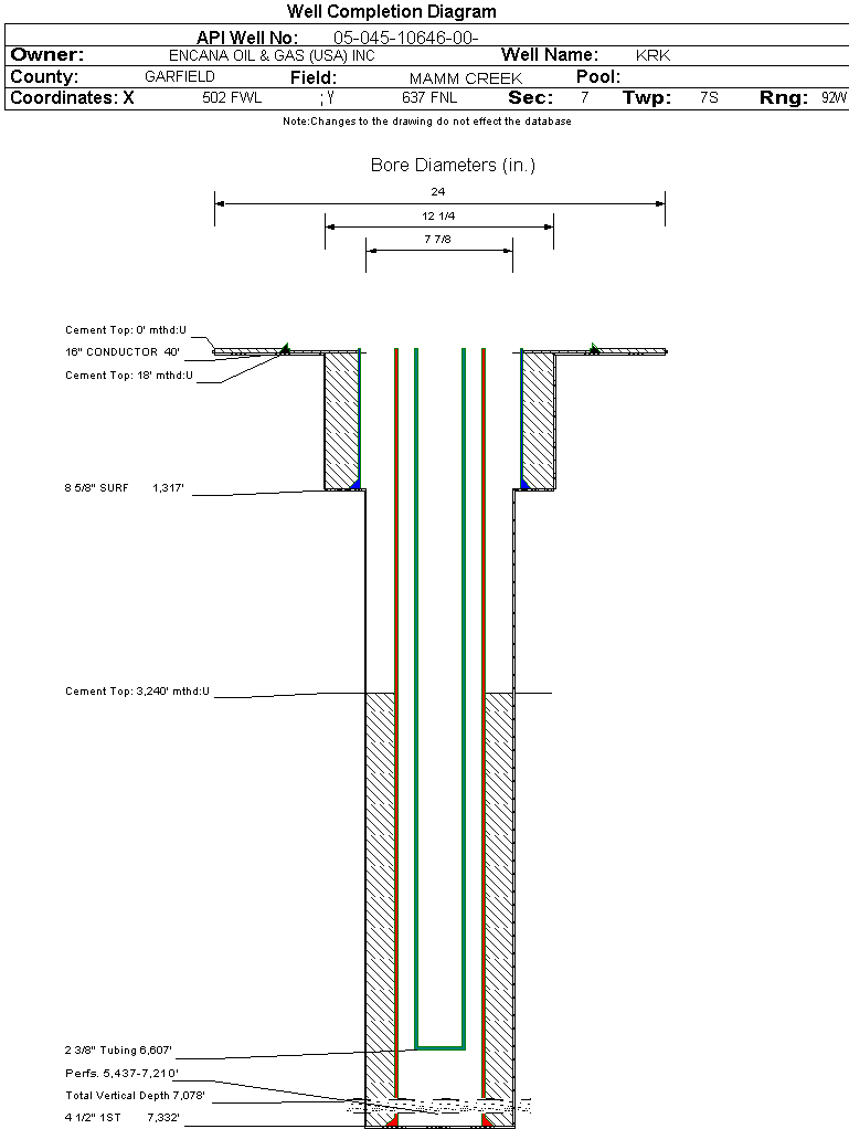 | Wellbore Completed | | Completion Date: | 1/26/2006 | | Spud Date: | 11/1/2005 | Spud Date Is: | ACTUAL | | Measured TD: | 7339 ft. | Measured PB depth: | 7289 ft. | | True Vertical TD: | 7078 ft. | True Vertical PB depth: | | | Top PZ Location: | Sec:7 Twp: 7S 92W | Footage: 1981 FNL 66 FWL | | Bottom Hole Location: | Sec:7 Twp: 7S 92W | Footage: 1981 FNL 66 FWL | | Log Types: | RST, CBL | | Casing: | String Type: CONDUCTOR, Hole Size: 24 in., Size: 16 in., Top: 0 ft., Depth: 40 ft., Weight: , Citings Type: ACTUAL | | Cement: | Sacks: , Top: 0 ft., Bottom: 40 ft., Determination Method: CALC | | Casing: | String Type: SURF, Hole Size: 12.25 in., Size: 8.625 in., Top: 0 ft., Depth: 1317 ft., Weight: , Citings Type: ACTUAL | | Cement: | Sacks: 860, Top: 18 ft., Bottom: 1317 ft., Determination Method: CALC | | Casing: | String Type: 1ST, Hole Size: 7.875 in., Size: 4.5 in., Top: 0 ft., Depth: 7332 ft., Weight: , Citings Type: ACTUAL | | Cement: | Sacks: 955, Top: 3240 ft., Bottom: 7332 ft., Determination Method: CALC | | Formation | Interval Top | Log Bottom | Cored | DSTs | | WASATCH | 0 ft. | 4208 ft. | N | N | | WILLIAMS FORK | 4209 ft. | | N | N |