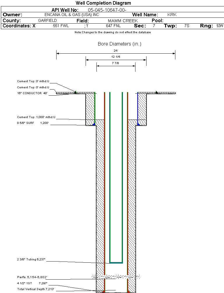 | Wellbore Completed | | Completion Date: | 12/3/2005 | | Spud Date: | 11/2/2005 | Spud Date Is: | ACTUAL | | Measured TD: | 7300 ft. | Measured PB depth: | 7238 ft. | | True Vertical TD: | 7213 ft. | True Vertical PB depth: | 0 ft. | | Top PZ Location: | Sec:7 Twp: 7S 92W | Footage: 385 FNL 1389 FWL | | Bottom Hole Location: | Sec:7 Twp: 7S 92W | Footage: 385 FNL 1389 FWL | | Log Types: | RST/GR/CCL; CBL/TEPM/CCL/GR | | Casing: | String Type: CONDUCTOR, Hole Size: 24 in., Size: 16 in., Top: 0 ft., Depth: 40 ft., Weight: , Citings Type: ACTUAL | | Cement: | Sacks: , Top: 0 ft., Bottom: 40 ft., Determination Method: CALC | | Casing: | String Type: SURF, Hole Size: 12.25 in., Size: 8.625 in., Top: 0 ft., Depth: 1200 ft., Weight: , Citings Type: ACTUAL | | Cement: | Sacks: 1075, Top: 0 ft., Bottom: 1200 ft., Determination Method: CALC | | Casing: | String Type: 1ST, Hole Size: 7.875 in., Size: 4.5 in., Top: 0 ft., Depth: 7297 ft., Weight: , Citings Type: ACTUAL | | Cement: | Sacks: 1640, Top: 1000 ft., Bottom: 7300 ft., Determination Method: CBL | | Formation | Interval Top | Log Bottom | Cored | DSTs | | WASATCH | 0 ft. | 3888 ft. | N | N | | WILLIAMS FORK | 3889 ft. | 7091 ft. | N | N | | ROLLINS | 7092 ft. | | N | N |