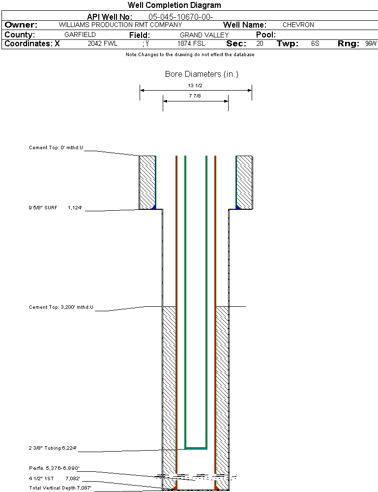 Wellbore #00 Wellbore Classification: OW Status: PR - 9/7/2005 Measured TD: 7089 ft. Vertical TD: 7087 ft.| Wellbore Data for Original Wellbore | Wellbore Classification: OW PR - 9/7/2005 | | Wellbore Permit | DIRECTIONAL | | Permit #: | 20051009 | Expiration Date: | 4/21/2006 | | Proposed Top PZ Location: | Sec: Twp: | Footage: 1875 FSL 2010 FWL | | Bottom Hole Location: | Sec: Twp: | Footage: 1875 FSL 2010 FWL | | Proposed Depth/Form: | 7126 ft. | | Surface Mineral Owner Same: | Yes | | Mineral Owner: | FEE | Surface Owner: | FEE | | Unit: | | Unit Number: | | | Formation And Spacing: | Code: WMFK , Formation: WILLIAMS FORK , Order: 139-38 , Unit Acreage: 160, Drill Unit: SW/4 |
