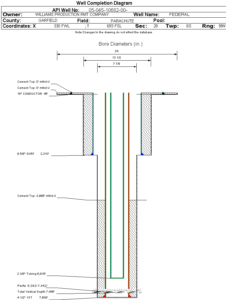 | Wellbore Completed | | Completion Date: | 9/22/2005 | | Spud Date: | 8/18/2005 | Spud Date Is: | ACTUAL | | Measured TD: | 7633 ft. | Measured PB depth: | 7576 ft. | | True Vertical TD: | 7445 ft. | True Vertical PB depth: | | | Top PZ Location: | Sec:29 Twp: 6S 95W | Footage: 163 FSL 875 FEL | | Bottom Hole Location: | Sec:29 Twp: 6S 95W | Footage: 163 FSL 875 FEL | | Log Types: | CBL; RESERVOIR MONITOR TOOL ELITE; TRIPLE: MUD LOG | | Casing: | String Type: CONDUCTOR, Hole Size: 24 in., Size: 18 in., Top: 0 ft., Depth: 45 ft., Weight: , Citings Type: ACTUAL | | Cement: | Sacks: 25, Top: 0 ft., Bottom: 45 ft., Determination Method: CALC | | Casing: | String Type: SURF, Hole Size: 13.5 in., Size: 9.625 in., Top: 0 ft., Depth: 2310 ft., Weight: , Citings Type: ACTUAL | | Cement: | Sacks: 605, Top: 0 ft., Bottom: 2310 ft., Determination Method: CALC | | Casing: | String Type: 1ST, Hole Size: 7.875 in., Size: 4.5 in., Top: 0 ft., Depth: 7608 ft., Weight: , Citings Type: ACTUAL | | Cement: | Sacks: 855, Top: 3996 ft., Bottom: 7607 ft., Determination Method: CBL | | Formation | Interval Top | Log Bottom | Cored | DSTs | | WASATCH G | 1952 ft. | | N | N | | FORT UNION | 2314 ft. | | N | N | | MESAVERDE | 4145 ft. | | N | N | | CAMEO | 6938 ft. | | N | N | | ROLLINS | 7546 ft. | | N | N |