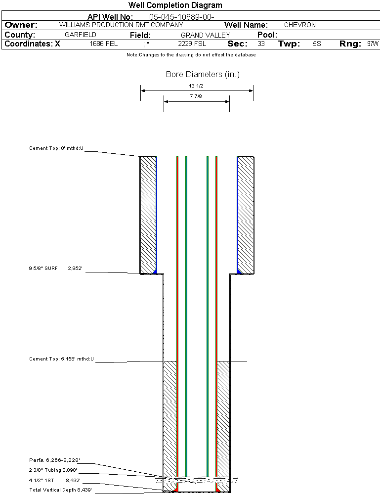 | Wellbore Completed | | Completion Date: | 6/8/2006 | | Spud Date: | 5/26/2006 | Spud Date Is: | ACTUAL | | Measured TD: | 8450 ft. | Measured PB depth: | 8400 ft. | | True Vertical TD: | 8439 ft. | True Vertical PB depth: | | | Top PZ Location: | Sec:33 Twp: 5S 97W | Footage: 2154 FSL 1979 FEL | | Bottom Hole Location: | Sec:33 Twp: 5S 97W | Footage: 2154 FSL 1979 FEL | | Log Types: | CBL;RESERVOIR MONITOR TOOL ELITE | | Casing: | String Type: SURF, Hole Size: 13.5 in., Size: 9.625 in., Top: 0 ft., Depth: 2952 ft., Weight: , Citings Type: ACTUAL | | Cement: | Sacks: 1343, Top: 0 ft., Bottom: 2951 ft., Determination Method: | | Casing: | String Type: 1ST, Hole Size: 7.875 in., Size: 4.5 in., Top: 0 ft., Depth: 8432 ft., Weight: , Citings Type: ACTUAL | | Cement: | Sacks: 820, Top: 5158 ft., Bottom: 8432 ft., Determination Method: | | Formation | Interval Top | Log Bottom | Cored | DSTs | | WASATCH G | 4004 ft. | | N | N | | FORT UNION | 4190 ft. | | N | N | | MESAVERDE | 5561 ft. | | N | N | | CAMEO | 7897 ft. | | N | N | | ROLLINS | 8286 ft. | | N | N |