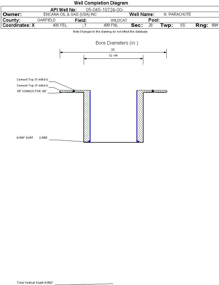 Wellbore #00 Wellbore Classification: DA Status: PA - 2/12/2006 Measured TD: 9866 ft. Vertical TD: 9562 ft.| Wellbore Data for Original Wellbore | Wellbore Classification: DA PA - 2/12/2006 | | Wellbore Permit | DIRECTIONAL | | Permit #: | 20051219 | Expiration Date: | 5/8/2006 | | Proposed Top PZ Location: | Sec:22 Twp: 5S 95W | Footage: 990 FSL 330 FWL | | Bottom Hole Location: | Sec:22 Twp: 5S 95W | Footage: 990 FSL 330 FWL | | Proposed Depth/Form: | 10749 ft. | | Surface Mineral Owner Same: | Yes | | Mineral Owner: | FEE | Surface Owner: | FEE | | Unit: | | Unit Number: | | | Formation And Spacing: | Code: WMFK , Formation: WILLIAMS FORK , Order: 479-15 , Unit Acreage: , Drill Unit: UNSPAC | | Casing: | String Type: CONDUCTOR, Hole Size: 16 in., Size: 13.375 in., Top: , Depth: 90 ft., Weight: 54 , Citings Type: PLANNED | | Cement: | Sacks: , Top: 0 ft., Bottom: 90 ft. | | Casing: | String Type: SURF, Hole Size: 12.25 in., Size: 9.625 in., Top: , Depth: 2500 ft., Weight: 36 , Citings Type: PLANNED | | Cement: | Sacks: 887, Top: 0 ft., Bottom: 2500 ft. | | Casing: | String Type: 1ST, Hole Size: 7.875 in., Size: 5.5 in., Top: , Depth: 10749 ft., Weight: 17 , Citings Type: PLANNED | | Cement: | Sacks: 691, Top: , Bottom: 10749 ft. |