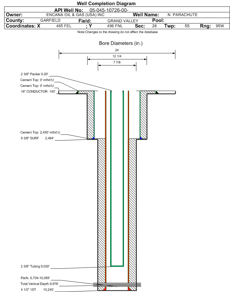 | Wellbore Completed | | Completion Date: | 1/27/2010 | | Spud Date: | 10/26/2005 | Spud Date Is: | ACTUAL | | Measured TD: | 10300 ft. | Measured PB depth: | 10182 ft. | | True Vertical TD: | 9976 ft. | True Vertical PB depth: | 9857 ft. | | Top PZ Location: | Sec:21 Twp: 5S 95W | Footage: 870 FSL 1138 FEL | | Bottom Hole Location: | Sec:21 Twp: 5S 95W | Footage: 846 FSL 1183 FEL | | Log Types: | | | Log Types: | | | Log Types: | RST, CBL AND MUD | | Casing: | String Type: CONDUCTOR, Hole Size: 24 in., Size: 16 in., Top: 0 ft., Depth: 140 ft., Weight: , Citings Type: ACTUAL | | Cement: | Sacks: , Top: 0 ft., Bottom: 0 ft., Determination Method: CALC | | Casing: | String Type: SURF, Hole Size: 12.25 in., Size: 9.375 in., Top: 0 ft., Depth: 2484 ft., Weight: , Citings Type: ACTUAL | | Cement: | Sacks: 920, Top: 0 ft., Bottom: 2490 ft., Determination Method: CALC | | Casing: | String Type: 1ST, Hole Size: 7.875 in., Size: 4.5 in., Top: 0 ft., Depth: 10245 ft., Weight: , Citings Type: ACTUAL | | Cement: | Sacks: 1226, Top: 2450 ft., Bottom: 10247 ft., Determination Method: CBL | | Formation | Interval Top | Log Bottom | Cored | DSTs | | WILLIAMS FORK | 6516 ft. | 10106 ft. | | | | ROLLINS | 10106 ft. | 10300 ft. | | |