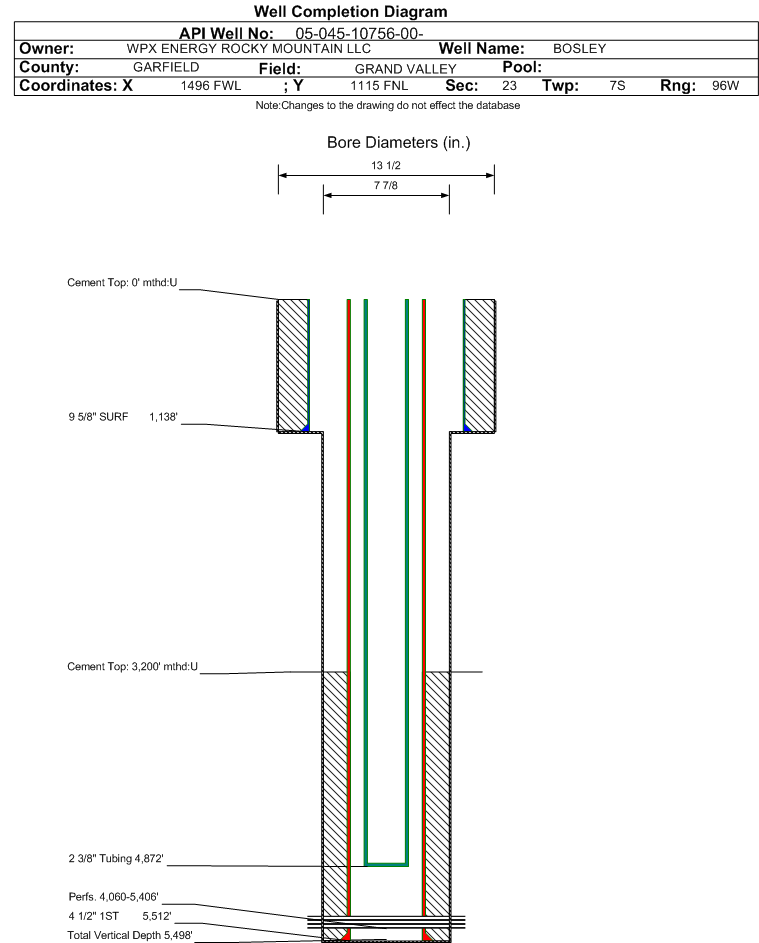 Wellbore #00 Wellbore Classification: GW Status: PR - 3/14/2006 Measured TD: 5555 ft. Vertical TD: 5498 ft.| Wellbore Data for Original Wellbore | Wellbore Classification: GW PR - 3/14/2006 | | Wellbore Permit | DIRECTIONAL | | Permit #: | 20051408 | Expiration Date: | 5/16/2006 | | Proposed Top PZ Location: | Sec: Twp: | Footage: 538 FNL 1562 FWL | | Bottom Hole Location: | Sec: Twp: | Footage: 538 FNL 1562 FWL | | Proposed Depth/Form: | 5651 ft. | | Surface Mineral Owner Same: | Yes | | Mineral Owner: | FEE | Surface Owner: | FEE | | Unit: | | Unit Number: | | | Formation And Spacing: | Code: WMFK , Formation: WILLIAMS FORK , Order: 510-14 , Unit Acreage: 160, Drill Unit: NW4 |