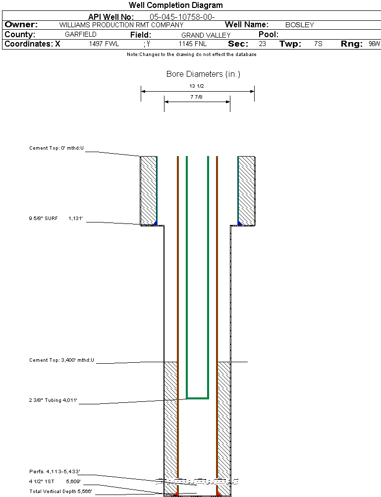 | Wellbore Completed | | Completion Date: | 12/29/2005 | | Spud Date: | 12/22/2005 | Spud Date Is: | ACTUAL | | Measured TD: | 5646 ft. | Measured PB depth: | 5560 ft. | | True Vertical TD: | 5566 ft. | True Vertical PB depth: | | | Top PZ Location: | Sec:23 Twp: 7S 96W | Footage: 754 FNL 2031 FWL | | Bottom Hole Location: | Sec:23 Twp: 7S 96W | Footage: 754 FNL 2031 FWL | | Log Types: | CBL; HIGH RESOLUTION INDUCTION, SPECTRAL DENSITY, DUAL SPACED NEUTRON | | Casing: | String Type: SURF, Hole Size: 13.5 in., Size: 9.625 in., Top: 0 ft., Depth: 1131 ft., Weight: , Citings Type: ACTUAL | | Cement: | Sacks: 375, Top: 0 ft., Bottom: 1131 ft., Determination Method: CALC | | Casing: | String Type: 1ST, Hole Size: 7.875 in., Size: 4.5 in., Top: 0 ft., Depth: 5609 ft., Weight: , Citings Type: ACTUAL | | Cement: | Sacks: 620, Top: 3400 ft., Bottom: 5609 ft., Determination Method: CBL | | Formation | Interval Top | Log Bottom | Cored | DSTs | | WASATCH G | 847 ft. | | N | N | | FORT UNION | 1264 ft. | | N | N | | MESAVERDE | 2671 ft. | | N | N | | CAMEO | 4998 ft. | | N | N | | ROLLINS | 5487 ft. | | N | N |
