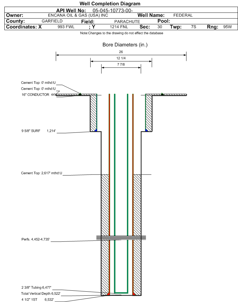 | Wellbore Completed | | Completion Date: | 8/9/2009 | | Spud Date: | 8/3/2009 | Spud Date Is: | ACTUAL | | Measured TD: | 6550 ft. | Measured PB depth: | 6477 ft. | | True Vertical TD: | 6522 ft. | True Vertical PB depth: | 6449 ft. | | Top PZ Location: | Sec:30 Twp: 7S 95W | Footage: 1519 FNL 666 FWL | | Bottom Hole Location: | Sec:30 Twp: 7S 95W | Footage: 1519 FNL 666 FWL | | Log Types: | RST, CBL | | Casing: | String Type: CONDUCTOR, Hole Size: , Size: , Top: 0 ft., Depth: 44 ft., Weight: 42# , Citings Type: ACTUAL | | Cement: | Sacks: , Top: 0 ft., Bottom: 40 ft., Determination Method: CALC | | Casing: | String Type: SURF, Hole Size: 12.25 in., Size: 8.625 in., Top: 0 ft., Depth: 1214 ft., Weight: 24# , Citings Type: ACTUAL | | Cement: | Sacks: 524, Top: 0 ft., Bottom: 1214 ft., Determination Method: VISU | | Casing: | String Type: 1ST, Hole Size: 7.875 in., Size: 4.5 in., Top: 0 ft., Depth: 6532 ft., Weight: 11.6# , Citings Type: ACTUAL | | Cement: | Sacks: 501, Top: 2617 ft., Bottom: 6532 ft., Determination Method: CBL | | Formation | Interval Top | Log Bottom | Cored | DSTs | | WASATCH | 0 ft. | 4137 ft. | N | N | | WILLIAMS FORK | 4138 ft. | 6433 ft. | N | N | | ROLLINS | 6434 ft. | 6550 ft. | N | N |