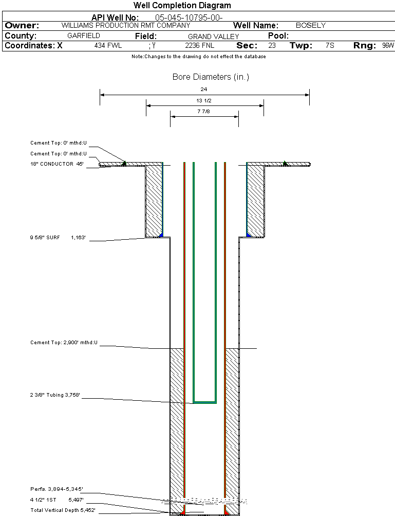 | Wellbore Completed | | Completion Date: | 2/16/2006 | | Spud Date: | 2/10/2006 | Spud Date Is: | ACTUAL | | Measured TD: | 5517 ft. | Measured PB depth: | 5475 ft. | | True Vertical TD: | 5452 ft. | True Vertical PB depth: | | | Top PZ Location: | Sec:23 Twp: 7S 96W | Footage: 2511 FNL 945 FWL | | Bottom Hole Location: | Sec:23 Twp: 7S 96W | Footage: 2511 FNL 945 FWL | | Log Types: | CBL; HIGH RESOLUTION IND./SPECTRAL DEN./DUAL SPACED NEU. | | Casing: | String Type: CONDUCTOR, Hole Size: 24 in., Size: 18 in., Top: 0 ft., Depth: 45 ft., Weight: , Citings Type: ACTUAL | | Cement: | Sacks: 25, Top: 0 ft., Bottom: 45 ft., Determination Method: CALC | | Casing: | String Type: SURF, Hole Size: 13.5 in., Size: 9.625 in., Top: 0 ft., Depth: 1163 ft., Weight: , Citings Type: ACTUAL | | Cement: | Sacks: 375, Top: 0 ft., Bottom: 1163 ft., Determination Method: CALC | | Casing: | String Type: 1ST, Hole Size: 7.875 in., Size: 4.5 in., Top: 0 ft., Depth: 5497 ft., Weight: , Citings Type: ACTUAL | | Cement: | Sacks: 800, Top: 2900 ft., Bottom: 5497 ft., Determination Method: CBL | | Formation | Interval Top | Log Bottom | Cored | DSTs | | WASATCH G | 859 ft. | | N | N | | FORT UNION | 1243 ft. | | N | N | | MESAVERDE | 2586 ft. | | N | N | | CAMEO | 4886 ft. | | N | N | | ROLLINS | 5396 ft. | | N | N |