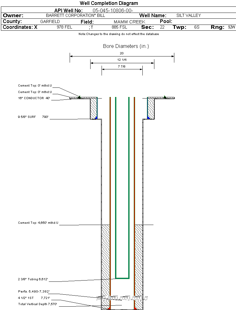 | Wellbore Completed | | Completion Date: | 11/20/2005 | | Spud Date: | 9/24/2005 | Spud Date Is: | ACTUAL | | Measured TD: | 7730 ft. | Measured PB depth: | 7678 ft. | | True Vertical TD: | 7570 ft. | True Vertical PB depth: | 7517 ft. | | Top PZ Location: | Sec:22 Twp: 6S 92W | Footage: 210 FSL 1864 FEL | | Bottom Hole Location: | Sec:22 Twp: 6S 92W | Footage: 210 FSL 1864 FEL | | Log Types: | HALLIBURTON SD/DSN/HRI/MICROLOG & PRECISION CBL | | Casing: | String Type: CONDUCTOR, Hole Size: 20 in., Size: 16 in., Top: , Depth: 40 ft., Weight: , Citings Type: ACTUAL | | Cement: | Sacks: , Top: 0 ft., Bottom: 40 ft., Determination Method: | | Casing: | String Type: SURF, Hole Size: 12.25 in., Size: 9.625 in., Top: 0 ft., Depth: 790 ft., Weight: , Citings Type: ACTUAL | | Cement: | Sacks: 250, Top: 0 ft., Bottom: 790 ft., Determination Method: | | Casing: | String Type: 1ST, Hole Size: 7.875 in., Size: 4.5 in., Top: 0 ft., Depth: 7721 ft., Weight: , Citings Type: ACTUAL | | Cement: | Sacks: 730, Top: 4650 ft., Bottom: 7721 ft., Determination Method: CBL | | Formation | Interval Top | Log Bottom | Cored | DSTs | | WILLIAMS FORK | 3671 ft. | | N | N | | ROLLINS | 7416 ft. | | N | N |