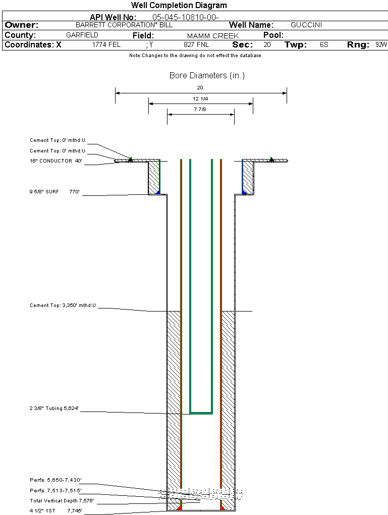 | Wellbore Completed | | Completion Date: | 4/14/2006 | | Spud Date: | 1/4/2006 | Spud Date Is: | ACTUAL | | Measured TD: | 7754 ft. | Measured PB depth: | 7702 ft. | | True Vertical TD: | 7576 ft. | True Vertical PB depth: | 7524 ft. | | Top PZ Location: | Sec:20 Twp: 6S 92W | Footage: 779 FNL 610 FEL | | Bottom Hole Location: | Sec:20 Twp: 6S 92W | Footage: 779 FNL 610 FEL | | Log Types: | HALLIBURTON SD/DSN/HRI/MICROLOG, PRECISION CBL/TEMP | | Casing: | String Type: CONDUCTOR, Hole Size: 20 in., Size: 16 in., Top: , Depth: 40 ft., Weight: , Citings Type: ACTUAL | | Cement: | Sacks: , Top: 0 ft., Bottom: 40 ft., Determination Method: CALC | | Casing: | String Type: SURF, Hole Size: 12.25 in., Size: 9.625 in., Top: 0 ft., Depth: 770 ft., Weight: , Citings Type: ACTUAL | | Cement: | Sacks: 230, Top: 0 ft., Bottom: 770 ft., Determination Method: CALC | | Casing: | String Type: 1ST, Hole Size: 7.875 in., Size: 4.5 in., Top: 0 ft., Depth: 7745 ft., Weight: , Citings Type: ACTUAL | | Cement: | Sacks: 910, Top: 3350 ft., Bottom: 7750 ft., Determination Method: CBL | | Formation | Interval Top | Log Bottom | Cored | DSTs | | WILLIAMS FORK | 3780 ft. | | N | N | | ROLLINS | 7457 ft. | | N | N |