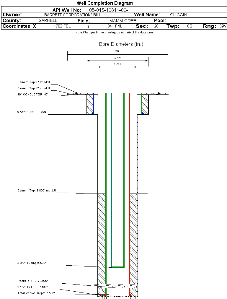 | Wellbore Completed | | Completion Date: | 4/27/2006 | | Spud Date: | 1/5/2006 | Spud Date Is: | ACTUAL | | Measured TD: | 7669 ft. | Measured PB depth: | 7624 ft. | | True Vertical TD: | 7585 ft. | True Vertical PB depth: | 7540 ft. | | Top PZ Location: | Sec:20 Twp: 6S 92W | Footage: 182 FNL 1989 FEL | | Bottom Hole Location: | Sec:20 Twp: 6S 92W | Footage: 182 FNL 1989 FEL | | Log Types: | HALLIBURTON SD/DSN/HRI & WEATHERFORD CBL/TEMP | | Casing: | String Type: CONDUCTOR, Hole Size: 20 in., Size: 16 in., Top: , Depth: 40 ft., Weight: , Citings Type: ACTUAL | | Cement: | Sacks: , Top: 0 ft., Bottom: 40 ft., Determination Method: | | Casing: | String Type: SURF, Hole Size: 12.25 in., Size: 9.625 in., Top: 0 ft., Depth: 799 ft., Weight: , Citings Type: ACTUAL | | Cement: | Sacks: 230, Top: 0 ft., Bottom: 799 ft., Determination Method: | | Casing: | String Type: 1ST, Hole Size: 7.875 in., Size: 4.5 in., Top: 0 ft., Depth: 7667 ft., Weight: , Citings Type: ACTUAL | | Cement: | Sacks: 985, Top: 3800 ft., Bottom: 7769 ft., Determination Method: CBL | | Formation | Interval Top | Log Bottom | Cored | DSTs | | WILLIAMS FORK | 3750 ft. | | N | N | | ROLLINS | 7416 ft. | | N | N |