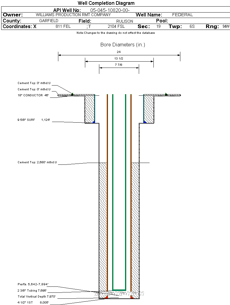 Wellbore #00 Wellbore Classification: GW Status: PR - 5/7/2006 Measured TD: 8018 ft. Vertical TD: 7970 ft.| Wellbore Data for Original Wellbore | Wellbore Classification: GW PR - 5/7/2006 | | Wellbore Permit | DIRECTIONAL | | Permit #: | 20051515 | Expiration Date: | 5/26/2006 | | Proposed Top PZ Location: | Sec: Twp: | Footage: 1509 FSL 424 FEL | | Bottom Hole Location: | Sec: Twp: | Footage: 1509 FSL 424 FEL | | Proposed Depth/Form: | 8094 ft. | | Surface Mineral Owner Same: | Yes | | Mineral Owner: | FEDERAL | Surface Owner: | FEDERAL | | Unit: | | Unit Number: | | | Formation And Spacing: | Code: WMFK , Formation: WILLIAMS FORK , Order: 139-40 , Unit Acreage: 320, Drill Unit: S2 |