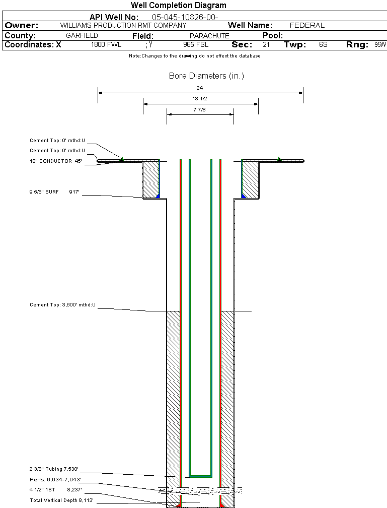| Wellbore Completed | | Completion Date: | 9/24/2005 | | Spud Date: | 9/10/2005 | Spud Date Is: | ACTUAL | | Measured TD: | 8253 ft. | Measured PB depth: | 8138 ft. | | True Vertical TD: | 8113 ft. | True Vertical PB depth: | | | Top PZ Location: | Sec: Twp: | Footage: 1060 FSL 600 FWL | | Bottom Hole Location: | Sec: Twp: | Footage: 1060 FSL 600 FWL | | Log Types: | CBL; HIGH RESOLUTION INDUCTION, SPECTRAL DENSITY, DUAL SPACED NEUTRON, MUD LOG | | Casing: | String Type: CONDUCTOR, Hole Size: 24 in., Size: 18 in., Top: 0 ft., Depth: 45 ft., Weight: , Citings Type: ACTUAL | | Cement: | Sacks: 25, Top: 0 ft., Bottom: 45 ft., Determination Method: CALC | | Casing: | String Type: SURF, Hole Size: 13.5 in., Size: 9.625 in., Top: 0 ft., Depth: 917 ft., Weight: , Citings Type: ACTUAL | | Cement: | Sacks: 285, Top: 0 ft., Bottom: 917 ft., Determination Method: CALC | | Casing: | String Type: 1ST, Hole Size: 7.875 in., Size: 4.5 in., Top: 0 ft., Depth: 8237 ft., Weight: , Citings Type: ACTUAL | | Cement: | Sacks: 890, Top: 3600 ft., Bottom: 8237 ft., Determination Method: CBL | | Formation | Interval Top | Log Bottom | Cored | DSTs | | FORT UNION | 2785 ft. | | N | N | | MESAVERDE | 4666 ft. | | N | N | | CAMEO | 7365 ft. | | N | N | | ROLLINS | 8118 ft. | | N | N |