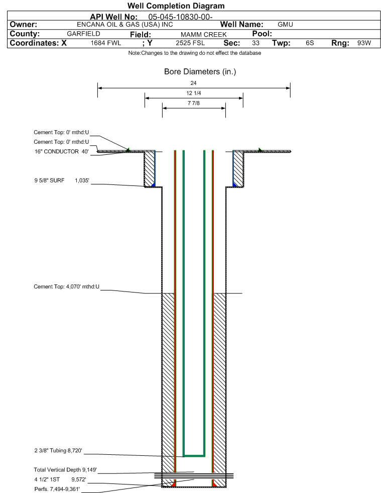 | Wellbore Completed | | Completion Date: | 6/20/2009 | | Spud Date: | 5/13/2009 | Spud Date Is: | ACTUAL | | Measured TD: | 9587 ft. | Measured PB depth: | 9530 ft. | | True Vertical TD: | 9149 ft. | True Vertical PB depth: | 9092 ft. | | Top PZ Location: | Sec:33 Twp: 6S 93W | Footage: 727 FNL 394 FWL | | Bottom Hole Location: | Sec:33 Twp: 6S 93W | Footage: 697 FNL 357 FWL | | Log Types: | CBL,RST | | Casing: | String Type: CONDUCTOR, Hole Size: 24 in., Size: 16 in., Top: 0 ft., Depth: 40 ft., Weight: , Citings Type: ACTUAL | | Cement: | Sacks: 100, Top: 0 ft., Bottom: 40 ft., Determination Method: CALC | | Casing: | String Type: SURF, Hole Size: 12.25 in., Size: 9.675 in., Top: 0 ft., Depth: 1035 ft., Weight: , Citings Type: ACTUAL | | Cement: | Sacks: 354, Top: 0 ft., Bottom: 1035 ft., Determination Method: CALC | | Casing: | String Type: 1ST, Hole Size: 7.875 in., Size: 4.5 in., Top: 0 ft., Depth: 9572 ft., Weight: , Citings Type: ACTUAL | | Cement: | Sacks: 1011, Top: 4070 ft., Bottom: 9569 ft., Determination Method: CBL | | Formation | Interval Top | Log Bottom | Cored | DSTs | | OHIO CREEK | 5706 ft. | 6464 ft. | | | | WILLIAMS FORK | 6465 ft. | 9446 ft. | | | | ROLLINS | 9447 ft. | 9587 ft. | | |