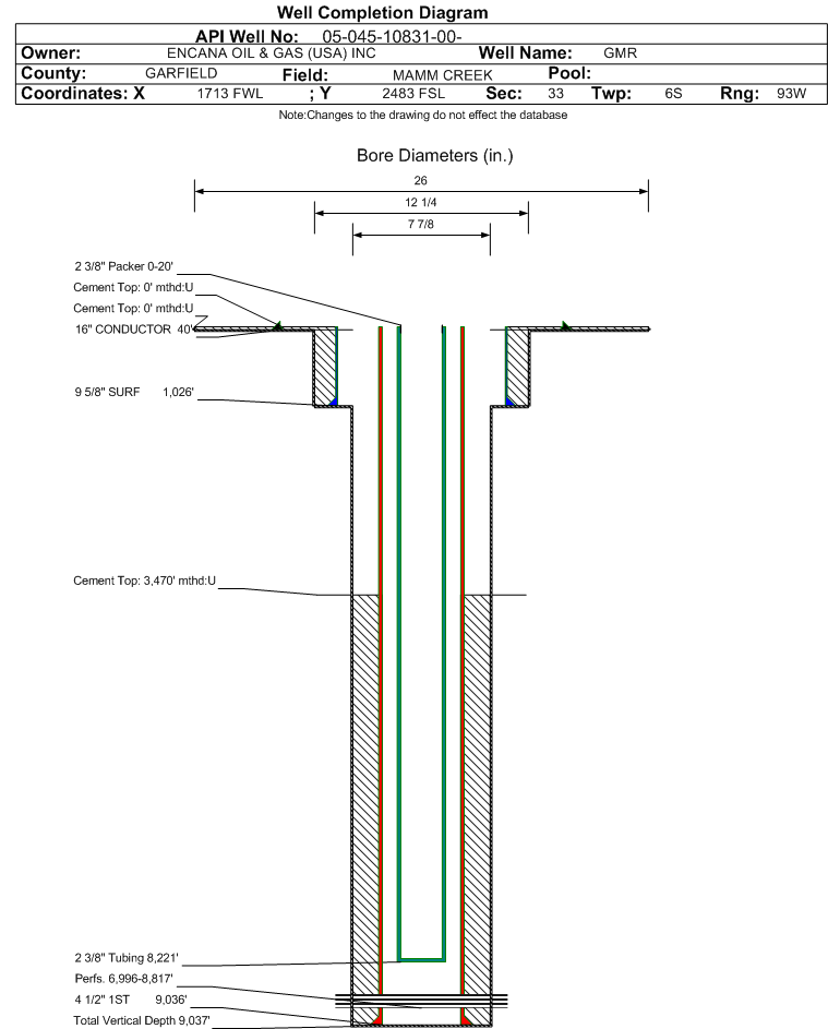 | Wellbore Completed | | Completion Date: | 8/19/2009 | | Spud Date: | 8/7/2009 | Spud Date Is: | ACTUAL | | Measured TD: | 9060 ft. | Measured PB depth: | 8989 ft. | | True Vertical TD: | 9037 ft. | True Vertical PB depth: | 8966 ft. | | Top PZ Location: | Sec:33 Twp: 6S 93W | Footage: 2047 FSL 1965 FWL | | Bottom Hole Location: | Sec:33 Twp: 6S 93W | Footage: 1981 FSL 1948 FWL | | Log Types: | CBL,RST | | Casing: | String Type: CONDUCTOR, Hole Size: 26 in., Size: 16 in., Top: 0 ft., Depth: 40 ft., Weight: , Citings Type: ACTUAL | | Cement: | Sacks: , Top: 0 ft., Bottom: 40 ft., Determination Method: CALC | | Casing: | String Type: SURF, Hole Size: 12.25 in., Size: 9.625 in., Top: 0 ft., Depth: 1026 ft., Weight: , Citings Type: ACTUAL | | Cement: | Sacks: 349, Top: 0 ft., Bottom: 1026 ft., Determination Method: CALC | | Casing: | String Type: 1ST, Hole Size: 7.875 in., Size: 4.5 in., Top: 0 ft., Depth: 9036 ft., Weight: , Citings Type: ACTUAL | | Cement: | Sacks: 945, Top: 3470 ft., Bottom: 9040 ft., Determination Method: CBL | | Formation | Interval Top | Log Bottom | Cored | DSTs | | WASATCH G | 2679 ft. | 5269 ft. | | | | OHIO CREEK | 5270 ft. | 5988 ft. | | | | WILLIAMS FORK | 5989 ft. | 8930 ft. | | | | ROLLINS | 8931 ft. | 9060 ft. | | |