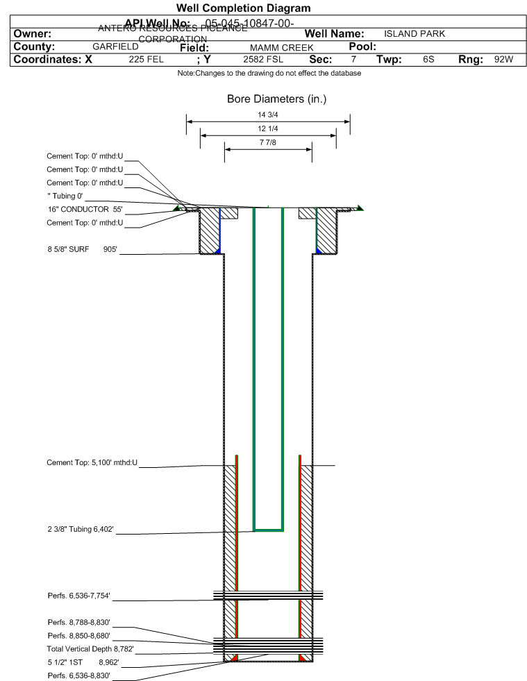 | Wellbore Completed | | Completion Date: | 10/25/2005 | | Spud Date: | 9/14/2005 | Spud Date Is: | ACTUAL | | Measured TD: | 8977 ft. | Measured PB depth: | 8914 ft. | | True Vertical TD: | 8782 ft. | True Vertical PB depth: | 8719 ft. | | Top PZ Location: | Sec:7 Twp: 6S 92W | Footage: 1894 FNL 652 FEL | | Bottom Hole Location: | Sec:7 Twp: 6S 92W | Footage: 1894 FNL 652 FEL | | Log Types: | CHI PROCESSED TRIPLE COMBO; GR/CCL/TEMP; CBL; MUD | | Casing: | String Type: CONDUCTOR, Hole Size: 14.75 in., Size: 16 in., Top: 0 ft., Depth: 55 ft., Weight: , Citings Type: ACTUAL | | Cement: | Sacks: 220, Top: 0 ft., Bottom: 55 ft., Determination Method: CALC | | Casing: | String Type: SURF, Hole Size: 12.25 in., Size: 8.625 in., Top: 0 ft., Depth: 905 ft., Weight: , Citings Type: ACTUAL | | Cement: | Sacks: 350, Top: 0 ft., Bottom: 905 ft., Determination Method: CALC | | Casing: | String Type: 1ST, Hole Size: 7.875 in., Size: 5.5 in., Top: 4892 ft., Depth: 8962 ft., Weight: , Citings Type: ACTUAL | | Cement: | Sacks: 1090, Top: 5100 ft., Bottom: 8962 ft., Determination Method: CBL | | Casing: | String Type: S.C. 1.1, Hole Size: , Size: , Top: , Depth: 214 ft., Weight: , Citings Type: ACTUAL | | Cement: | Sacks: 100, Top: 0 ft., Bottom: 214 ft., Determination Method: CALC | | Casing: | String Type: 2ND, Hole Size: , Size: , Top: , Depth: , Weight: , Citings Type: ACTUAL | | Cement: | Sacks: , Top: , Bottom: , Determination Method: CALC | | Formation | Interval Top | Log Bottom | Cored | DSTs | | WILLIAMS FORK | 4366 ft. | | N | N | | CAMEO | 7009 ft. | | N | N | | ROLLINS | 7977 ft. | | N | N | | COZZETTE | 8530 ft. | | N | N | | CORCORAN | 8788 ft. | | N | N |