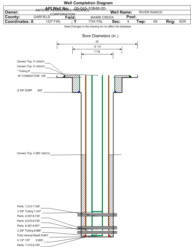 | | Perforation Data: | | Interval Top: | 7310 ft. | # Of Holes: | 324 | | Interval Bottom: | 7785 ft. | Hole Size: | 0.42 in. |