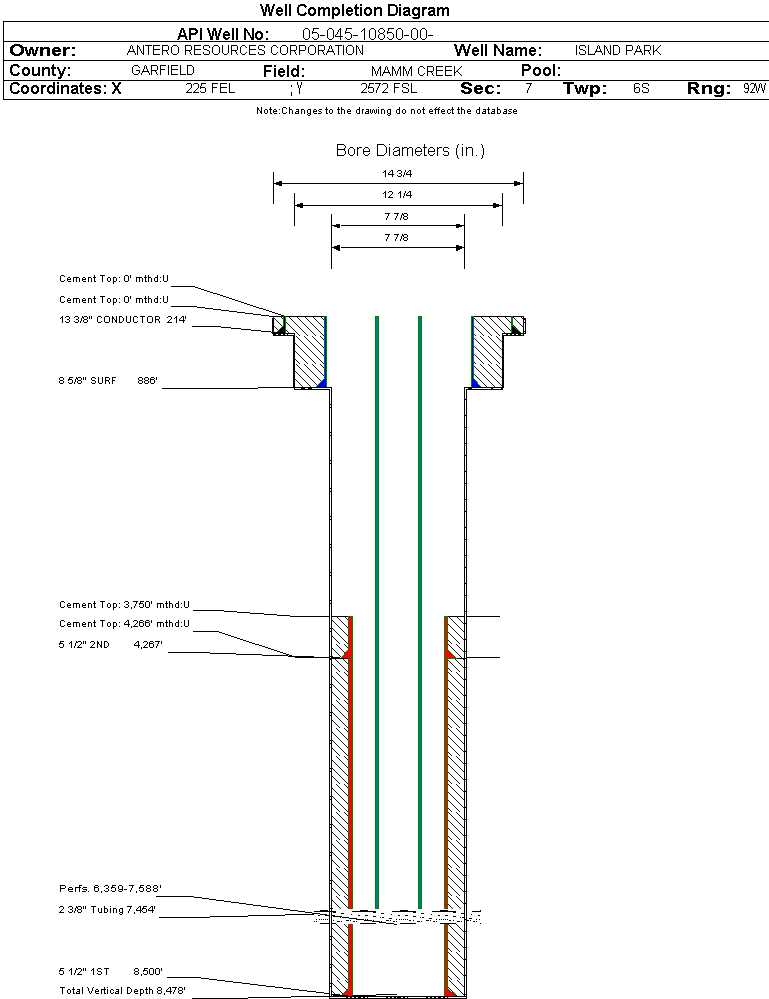 | Wellbore Completed | | Completion Date: | 9/13/2005 | | Spud Date: | 8/11/2005 | Spud Date Is: | ACTUAL | | Measured TD: | 8530 ft. | Measured PB depth: | 8452 ft. | | True Vertical TD: | 8478 ft. | True Vertical PB depth: | 8400 ft. | | Top PZ Location: | Sec: Twp: | Footage: 2419 FNL 857 FEL | | Bottom Hole Location: | Sec: Twp: | Footage: 2419 FNL 857 FEL | | Log Types: | | | Casing: | String Type: CONDUCTOR, Hole Size: 14.75 in., Size: 13.375 in., Top: 0 ft., Depth: 214 ft., Weight: 48 , Citings Type: ACTUAL | | Cement: | Sacks: 100, Top: 0 ft., Bottom: 214 ft., Determination Method: CALC | | Casing: | String Type: SURF, Hole Size: 12.25 in., Size: 8.625 in., Top: 0 ft., Depth: 886 ft., Weight: 24 , Citings Type: ACTUAL | | Cement: | Sacks: 350, Top: 0 ft., Bottom: 886 ft., Determination Method: CALC | | Casing: | String Type: 1ST, Hole Size: 7.875 in., Size: 5.5 in., Top: 4266 ft., Depth: 8500 ft., Weight: 17 , Citings Type: ACTUAL | | Cement: | Sacks: 655, Top: 4266 ft., Bottom: 8500 ft., Determination Method: CBL | | Casing: | String Type: 2ND, Hole Size: 7.875 in., Size: 5.5 in., Top: 3750 ft., Depth: 4267 ft., Weight: 17 , Citings Type: ACTUAL | | Cement: | Sacks: 80, Top: 3750 ft., Bottom: 4267 ft., Determination Method: CBL | | Formation | Interval Top | Log Bottom | Cored | DSTs | | WILLIAMS FORK | 4187 ft. | 7791 ft. | N | N | | CAMEO | 6883 ft. | 7791 ft. | N | N | | ROLLINS | 7791 ft. | 8344 ft. | N | N | | COZZETTE | 8344 ft. | | N | N |