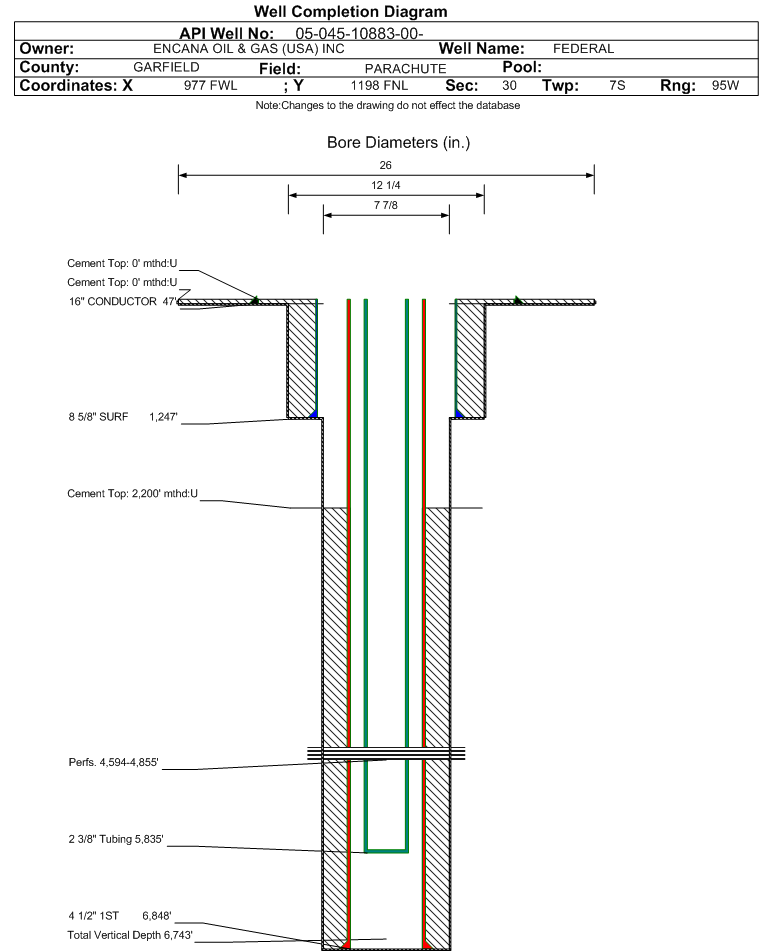 Wellbore #00 Wellbore Classification: GW Status: PR - 8/1/2020 Measured TD: 6860 ft. Vertical TD: 6743 ft.| Wellbore Data for Original Wellbore | Wellbore Classification: GW PR - 8/1/2020 | | Wellbore Permit | DIRECTIONAL | | Permit #: | 20091070 | Expiration Date: | 6/10/2010 | | Proposed Top PZ Location: | Sec: Twp: | Footage: 250 FNL 660 FWL | | Bottom Hole Location: | Sec:30 Twp: 7S 95W | Footage: 250 FNL 660 FWL | | Proposed Depth/Form: | 6946 ft. | | Surface Mineral Owner Same: | Yes | | Mineral Owner: | FEDERAL | Surface Owner: | FEDERAL | | Unit: | | Unit Number: | | | Formation And Spacing: | Code: ILES , Formation: ILES , Order: 139-46 , Unit Acreage: 640, Drill Unit: ALL | | Formation And Spacing: | Code: WMFK , Formation: WILLIAMS FORK , Order: 139-44 , Unit Acreage: 640, Drill Unit: ALL |